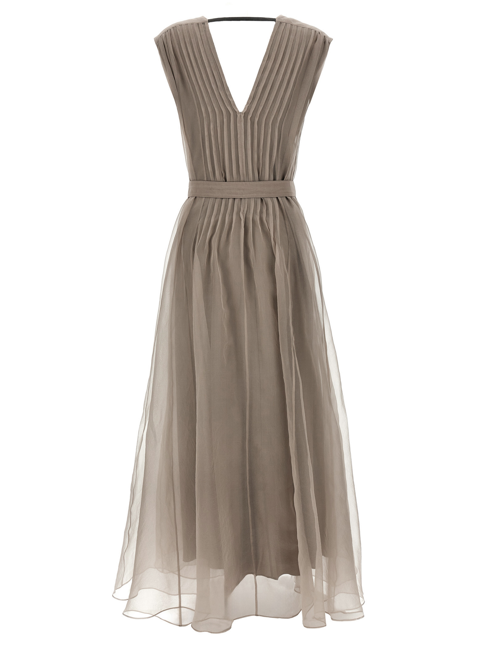 Long silk dress with pleats on the front and back, V-neck on the front and back with Monile detail on the back, sleeveless, integrated petticoat, removable matching belt.
