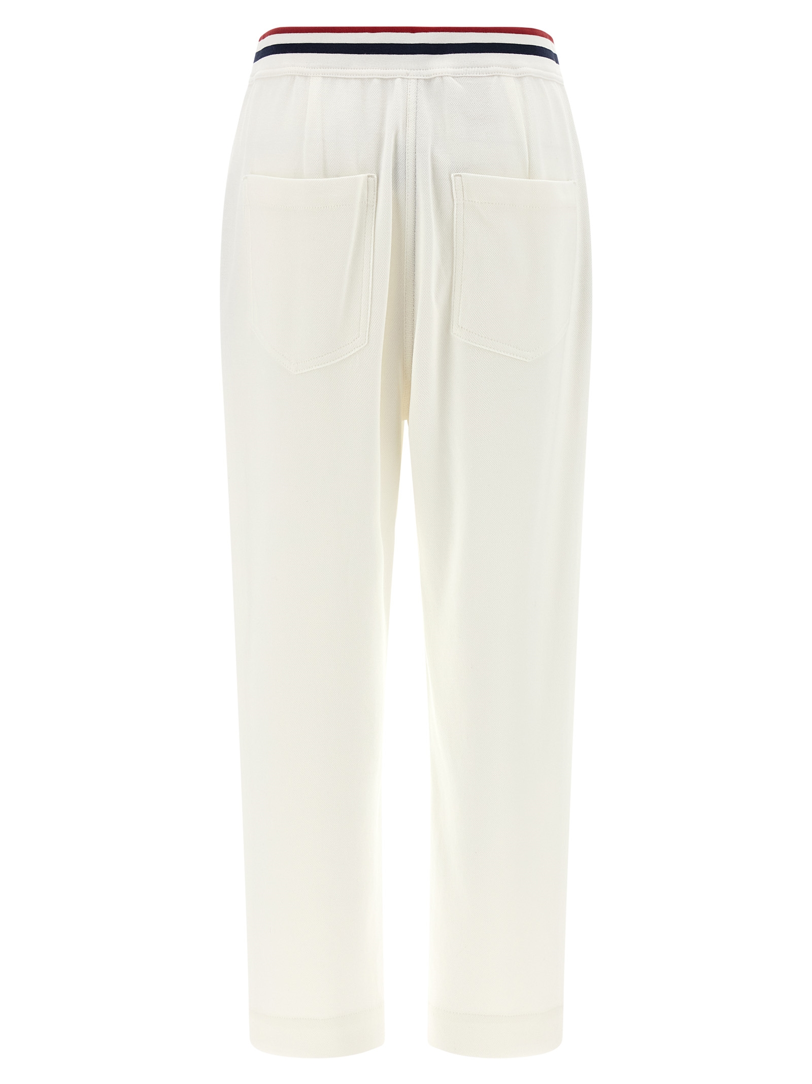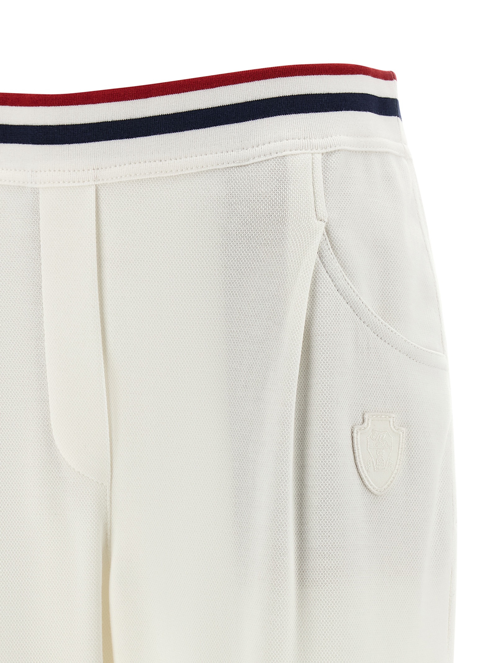 Honeycomb stretch cotton joggers, tricolor elastic band at the waist, tone-on-tone heraldic coat of arms of Solomeo patch on the front, trompe l'oeil flap, pins, straight leg, pockets.