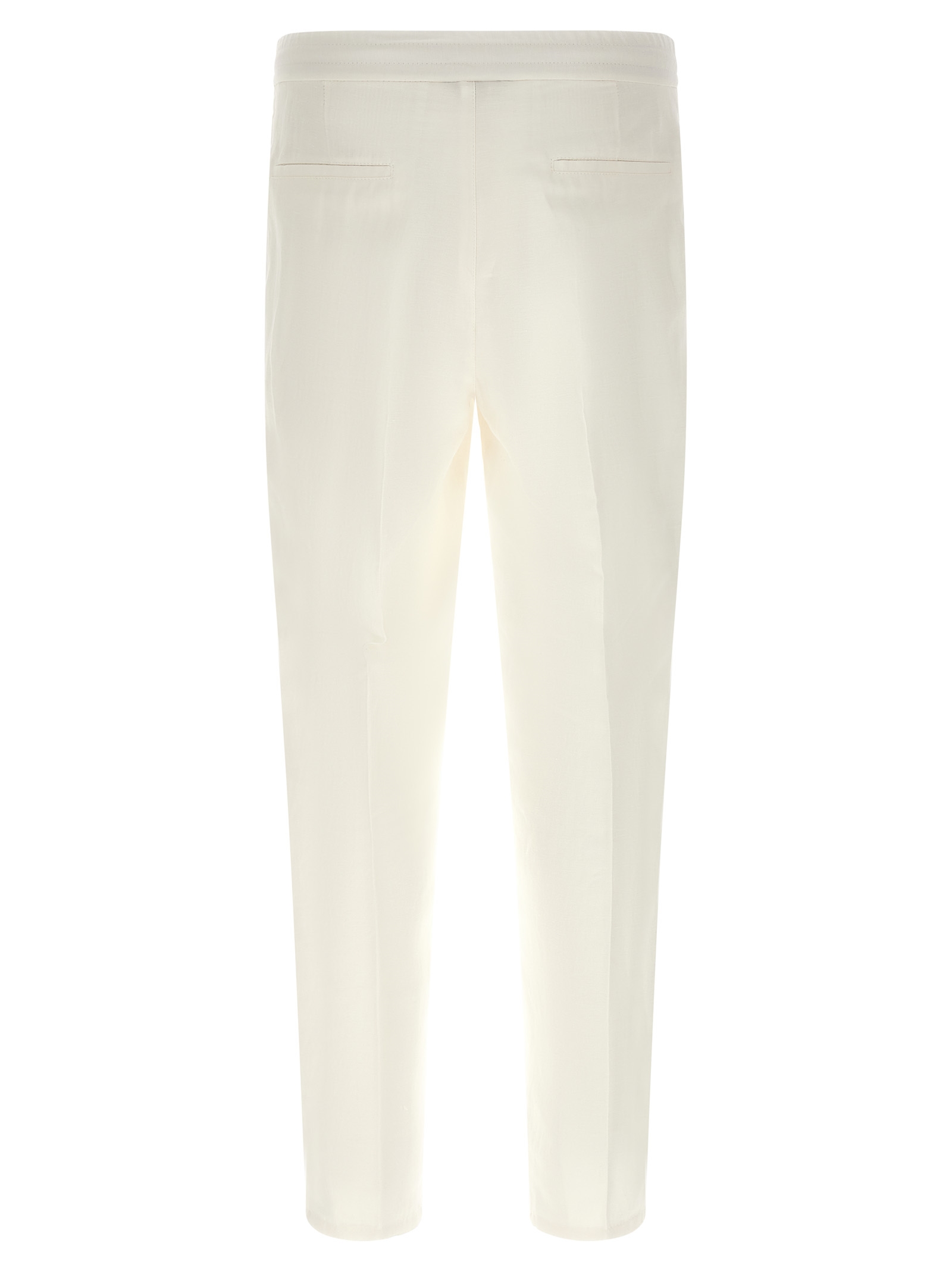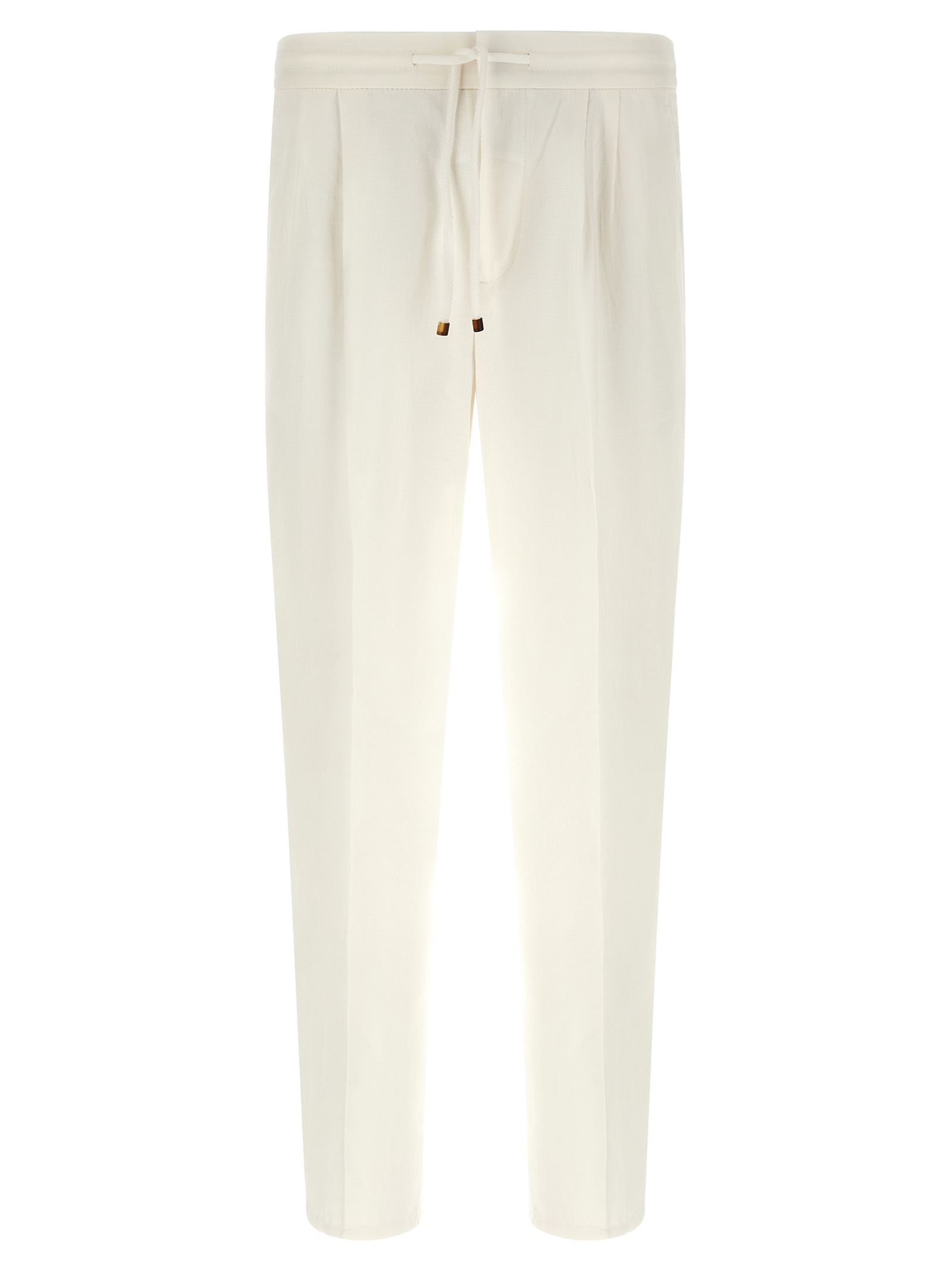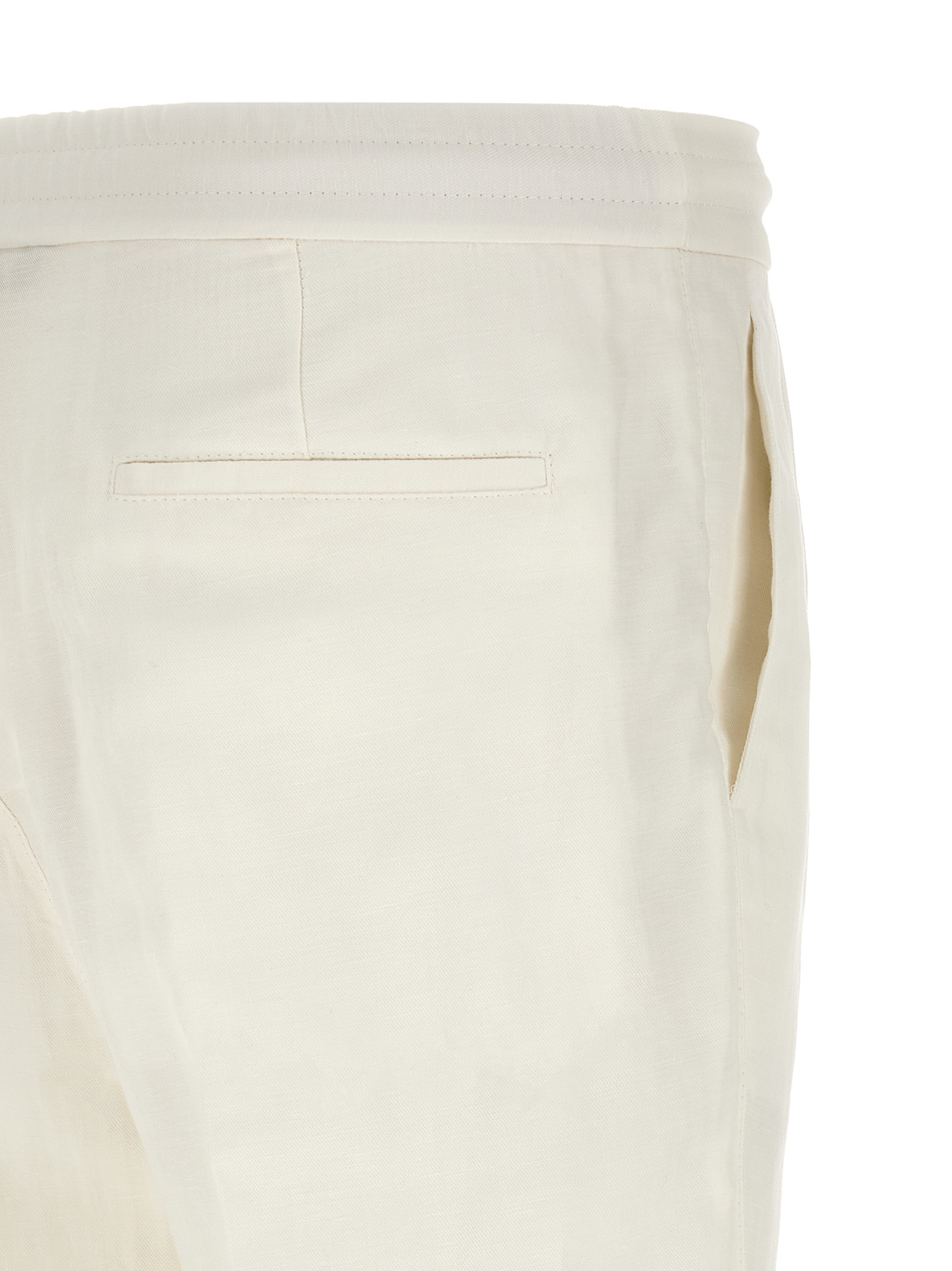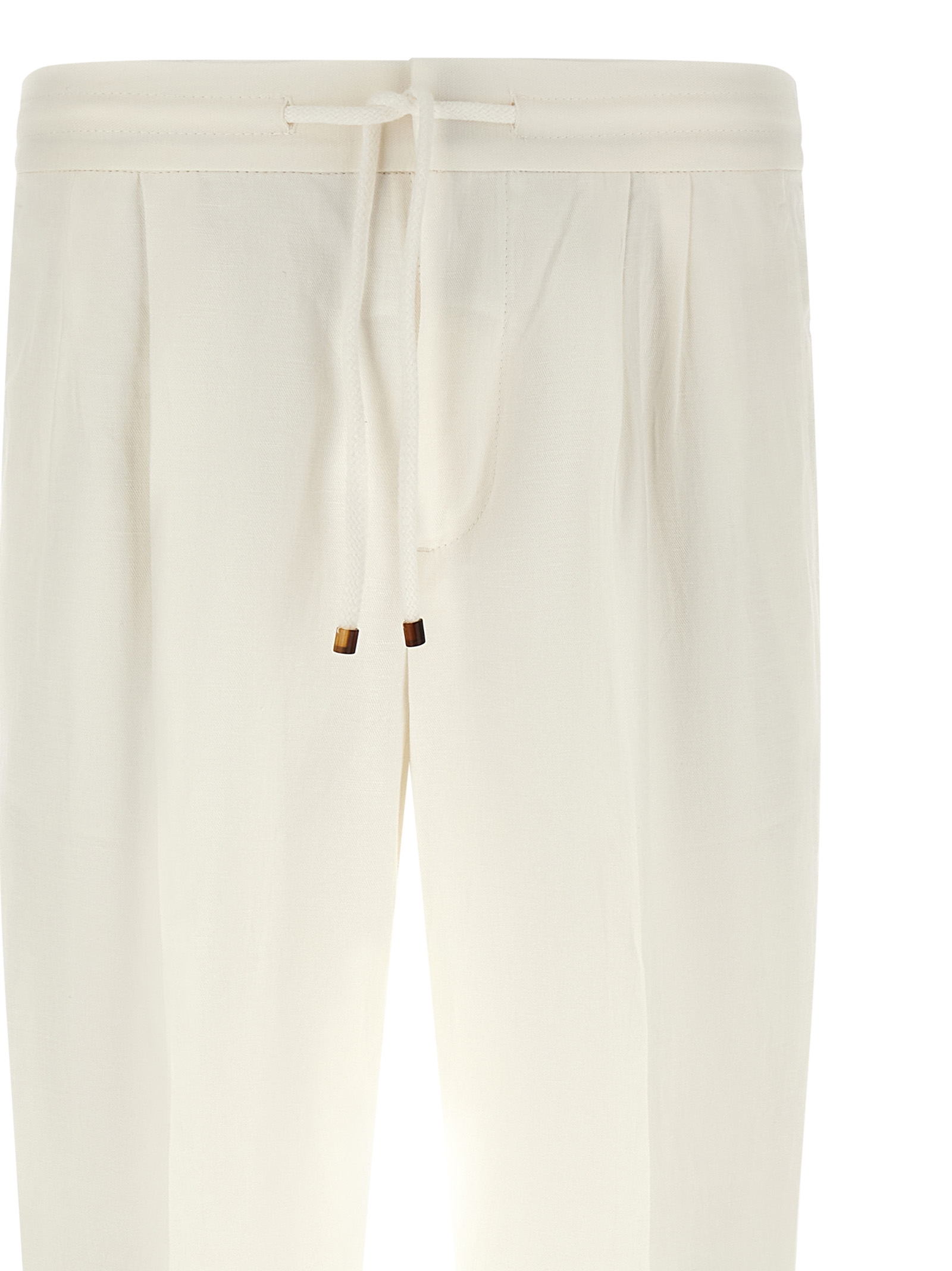 Linen and cotton blend pants, adjustable drawstring elastic at the waist, hook and button zip closure, pockets, straight leg with stretched crease.