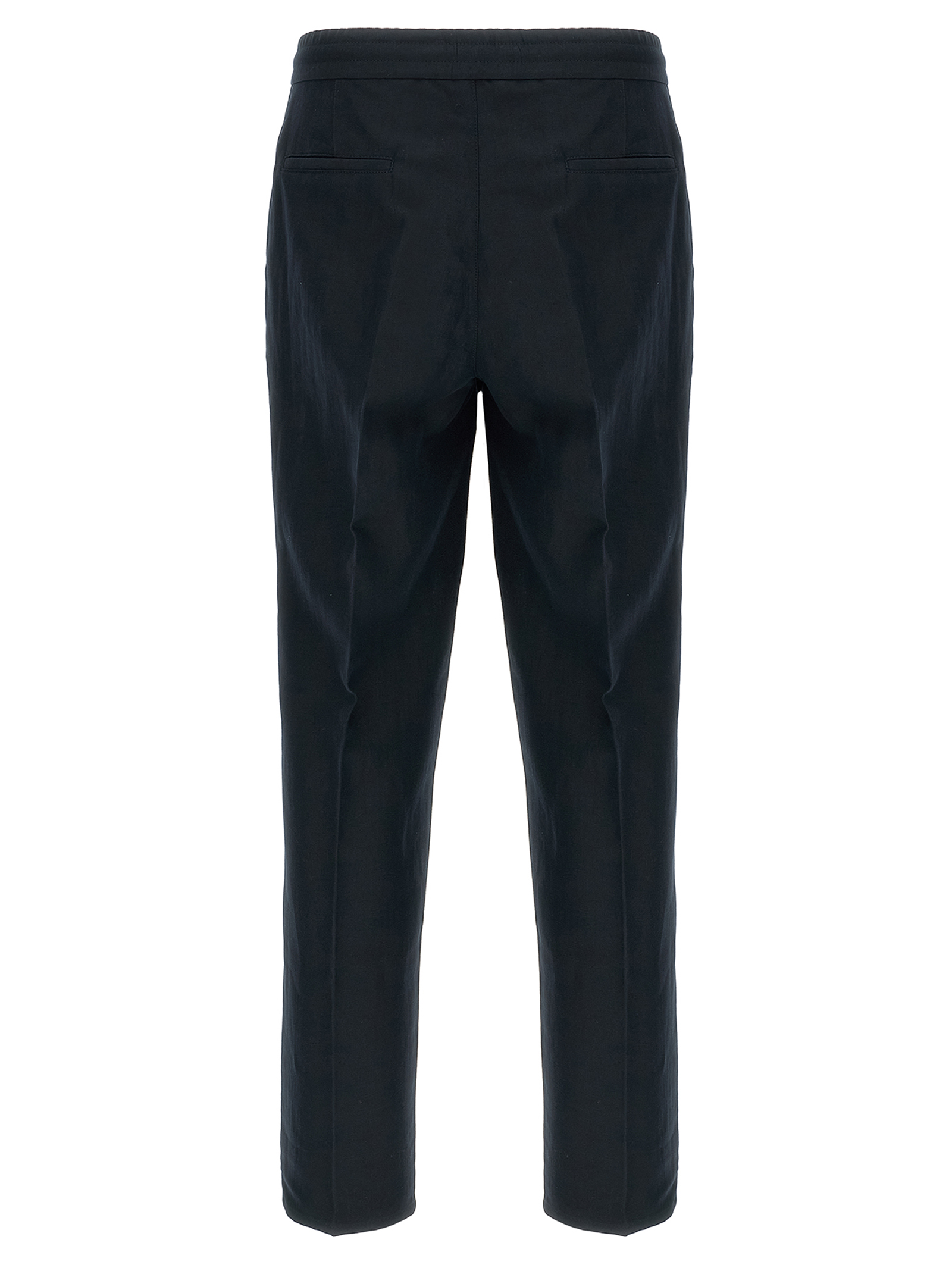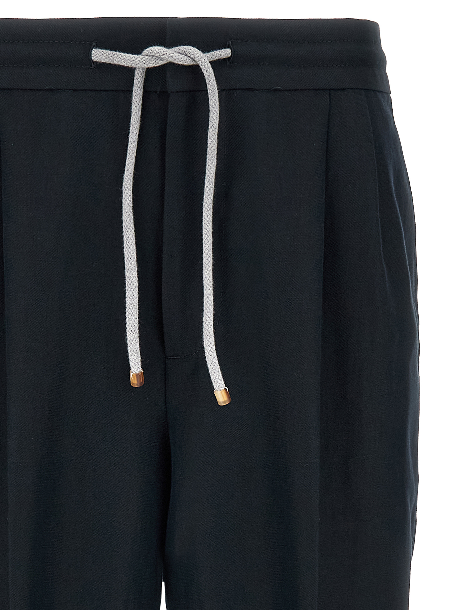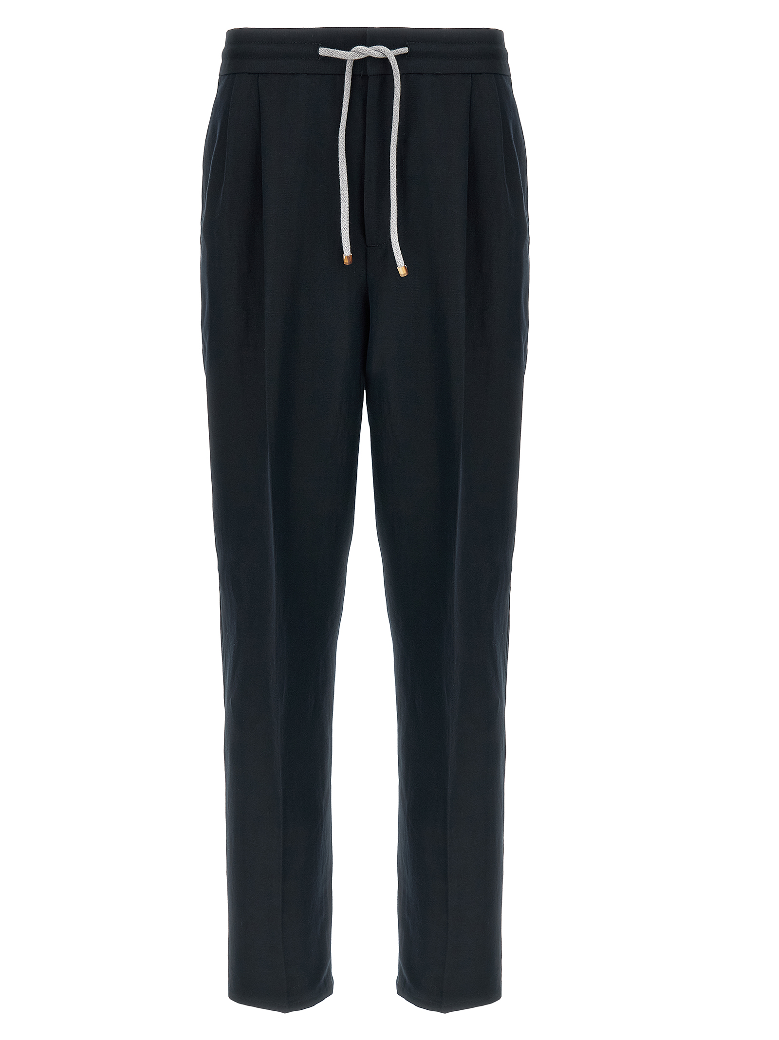 Linen and cotton blend pants, adjustable drawstring elastic at the waist, hook and button zip closure, pockets, straight leg with stretched crease.