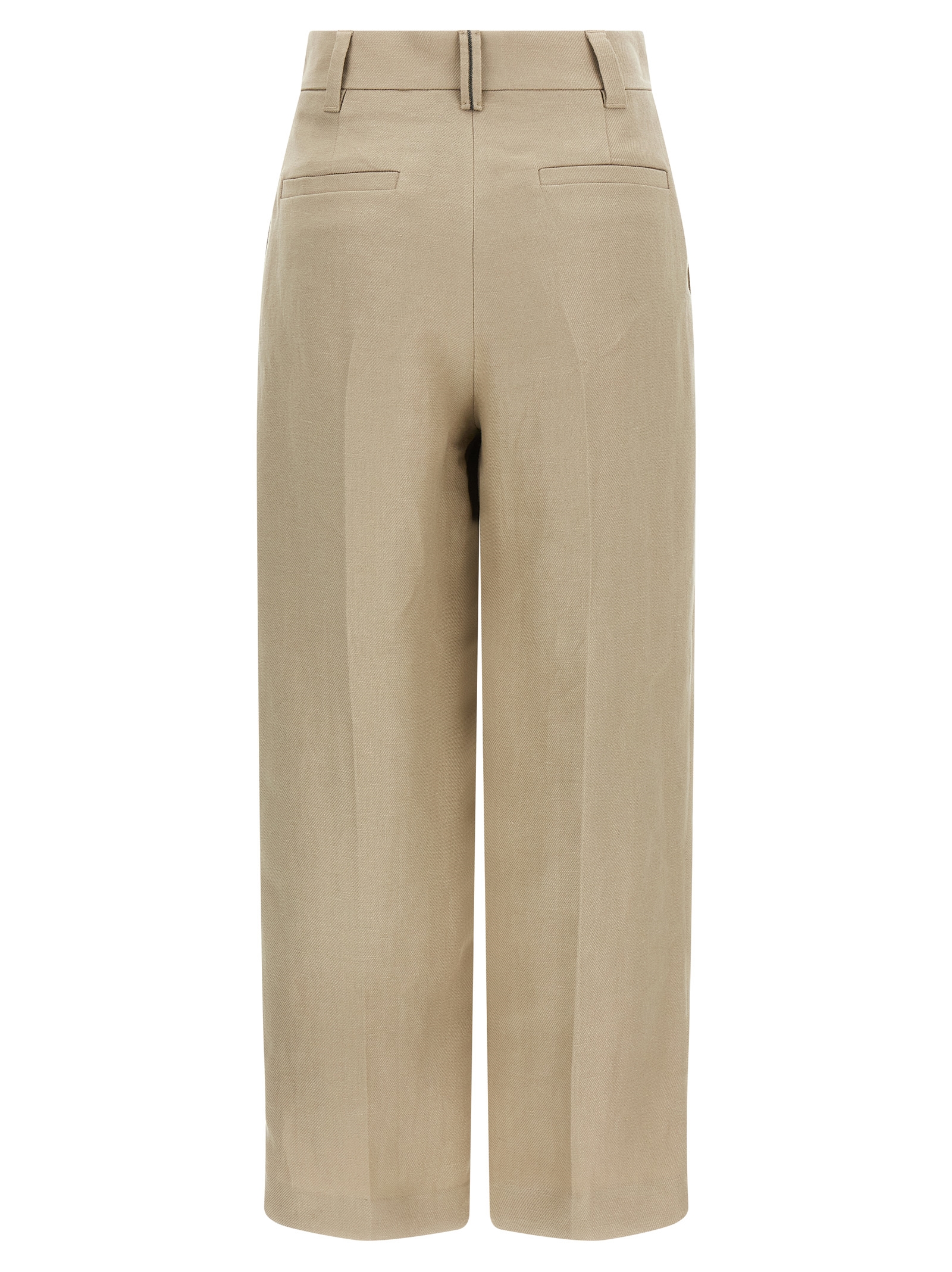 Linen trousers, pince, wide leg, ironed pleat, zip hook and front button closure, pockets, back Monile detail.
