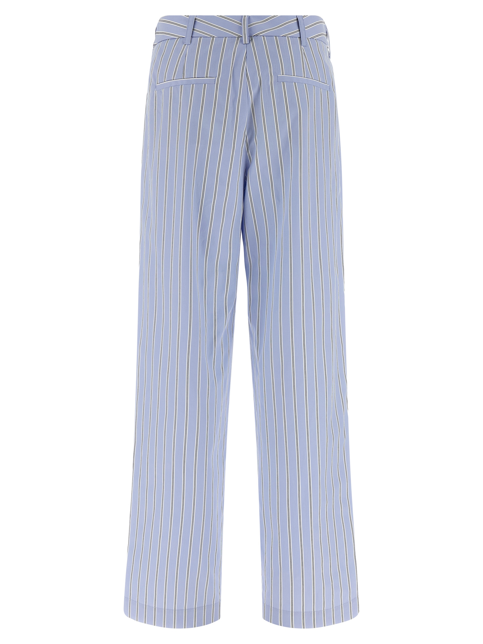 'Sally' striped cotton poplin pants, front button closure, front pincers, straight and wide leg, side pockets and back welt pockets, belt with loops.