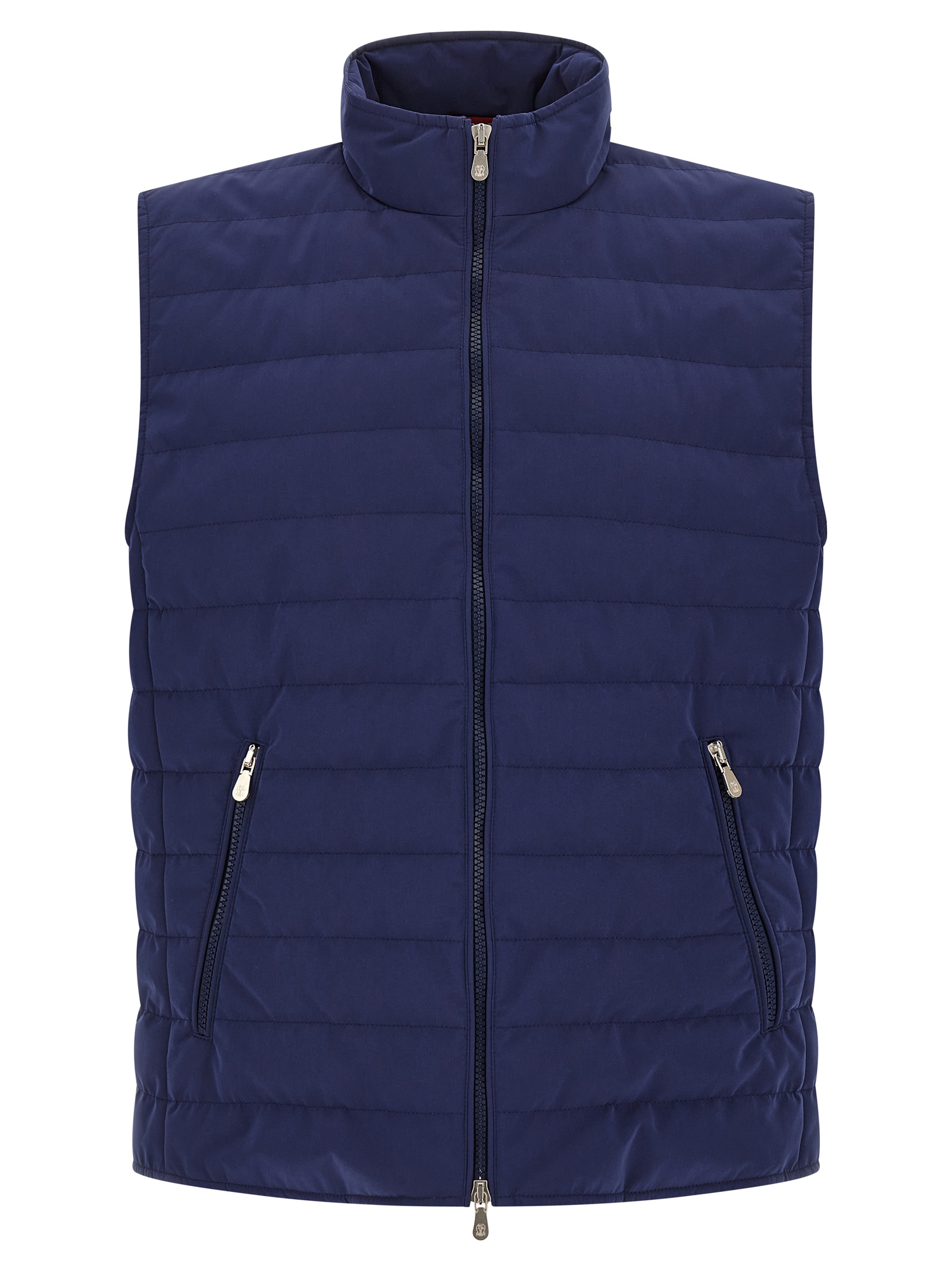 Breathable and water-repellent, quilted and slightly goose feather padded waistcoat in membrane nylon, water-repellent nylon lining, high neck, front zip closure, pockets.