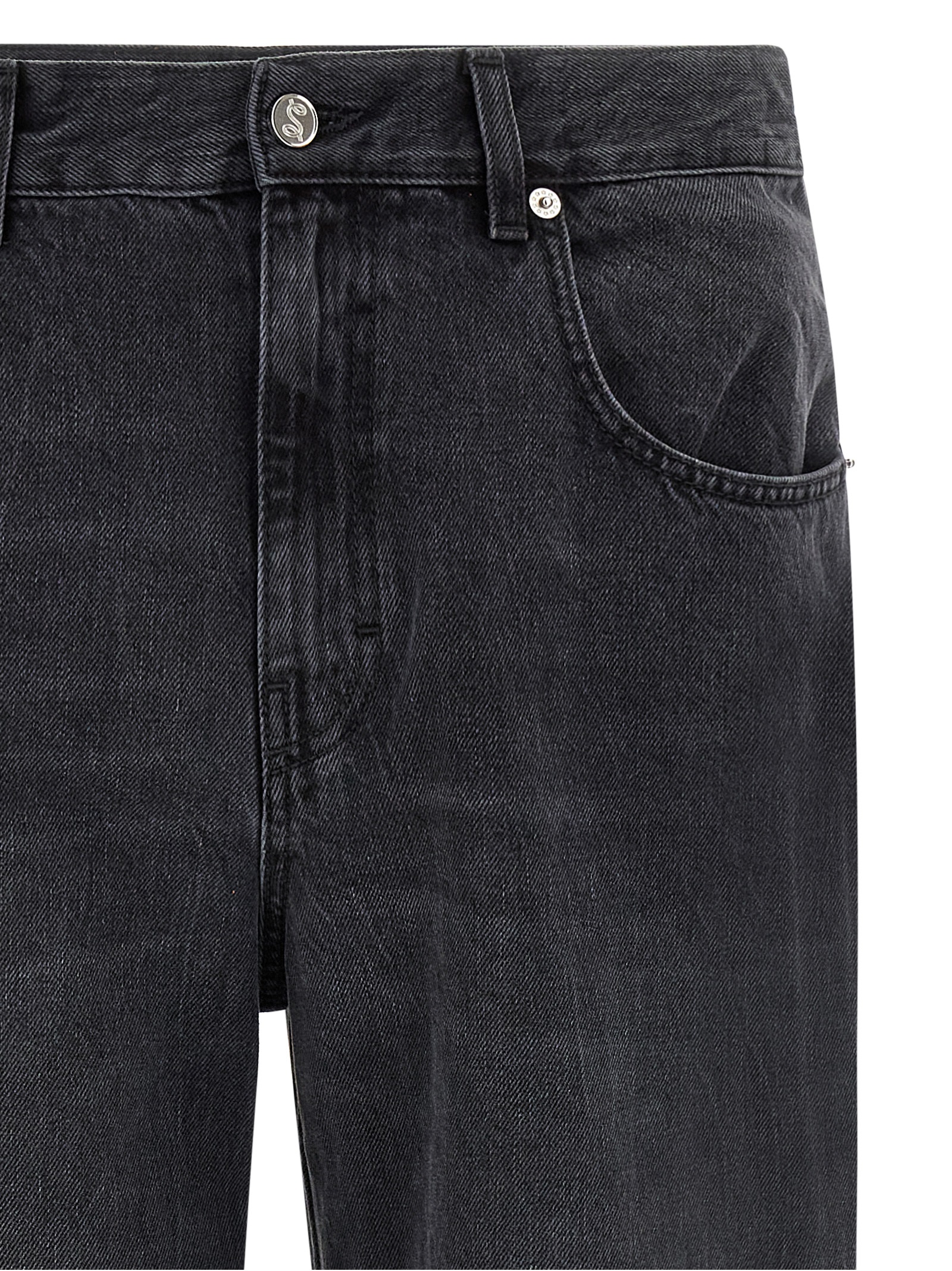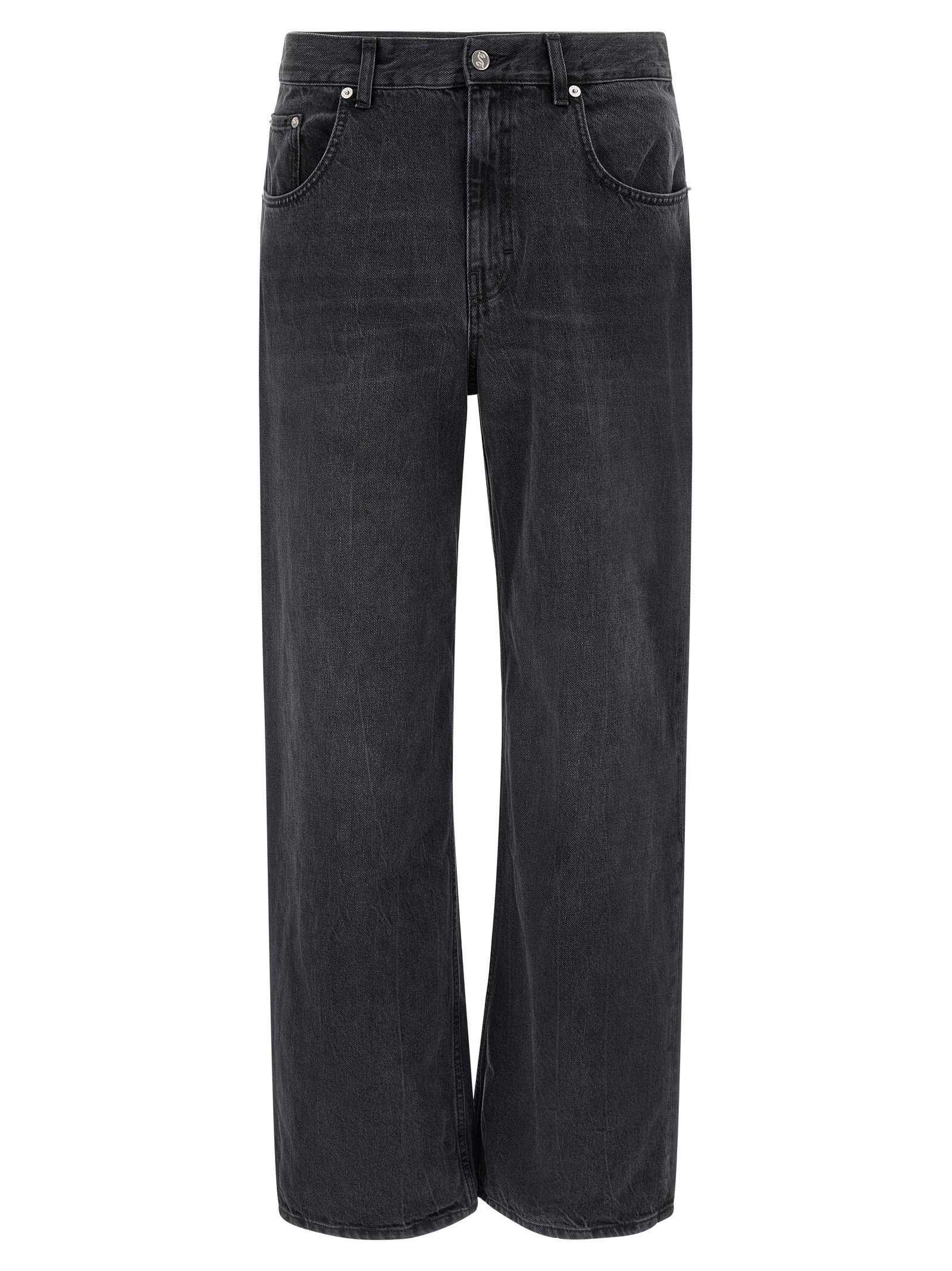 Cotton denim jeans, 5-pocket model, medium waist and slightly dropped crotch, vintage effect wash, straight leg, front zip and button closure.