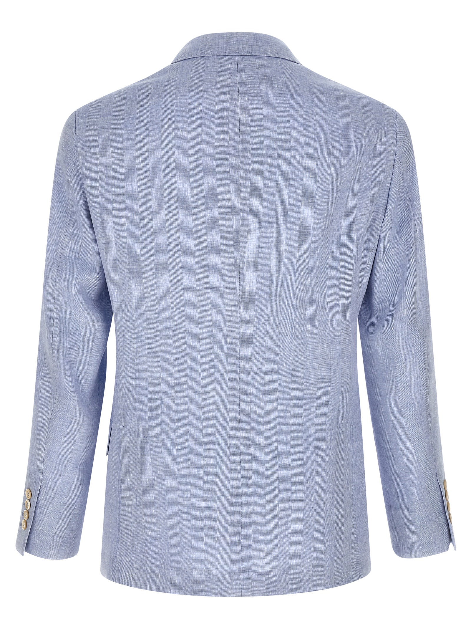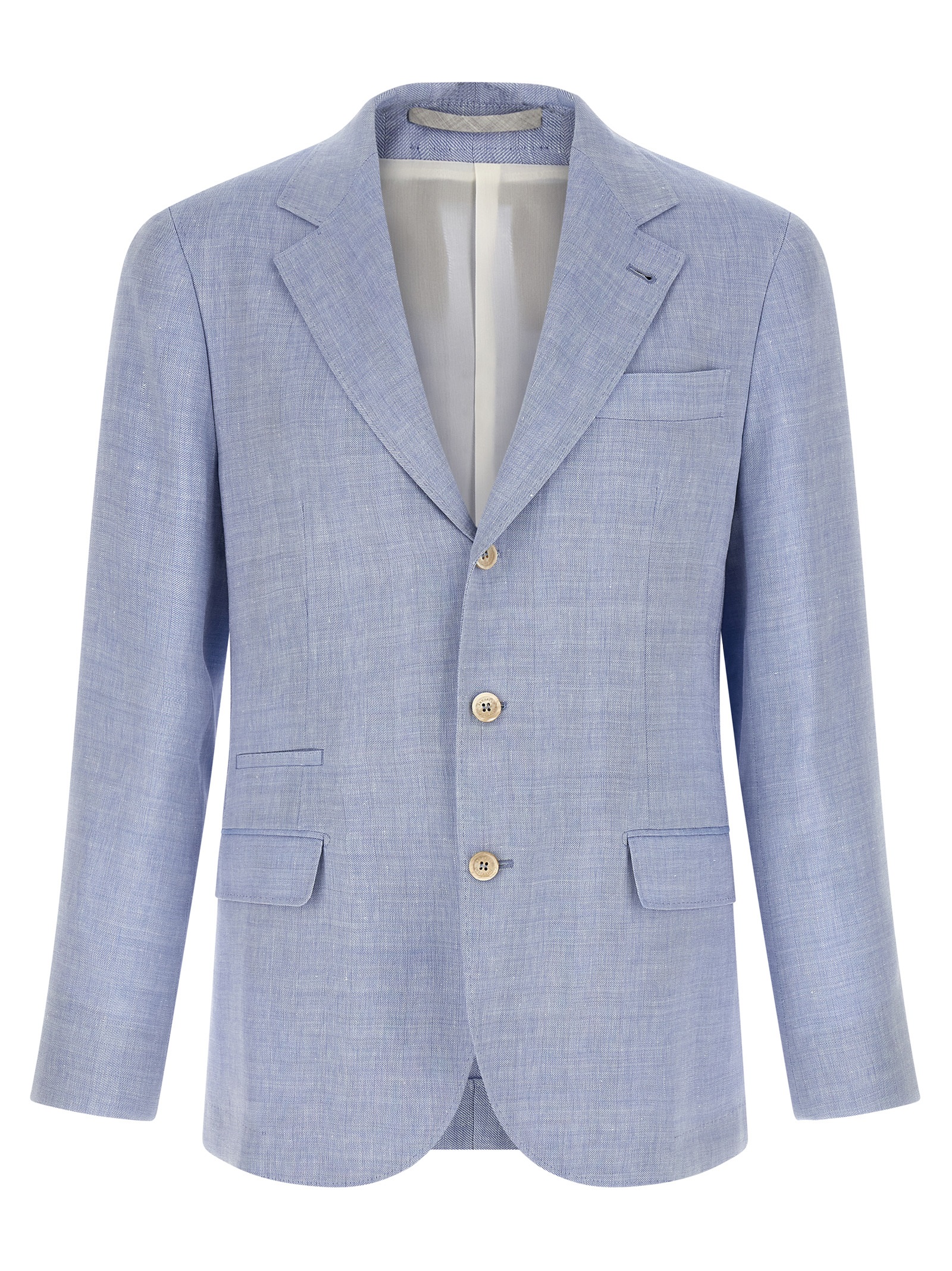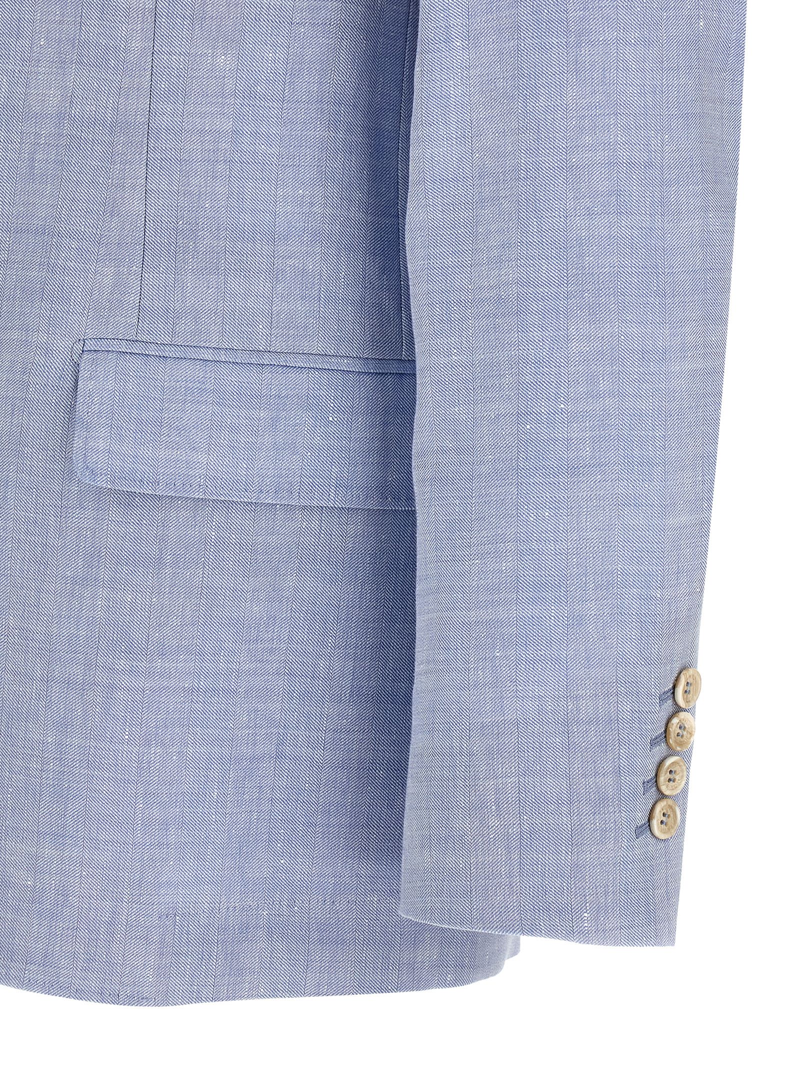 Deconstructed linen and virgin wool blazer Chevron texture, single-breasted model with three buttons closure in two-ironed horn, mirror lapels, flap pockets, ticket pocket and chest pocket, two internal pockets with button closure and pen pocket, 'Spalla Solomeo', cuffs with opening buttonholes, half cupro lining, back vents.