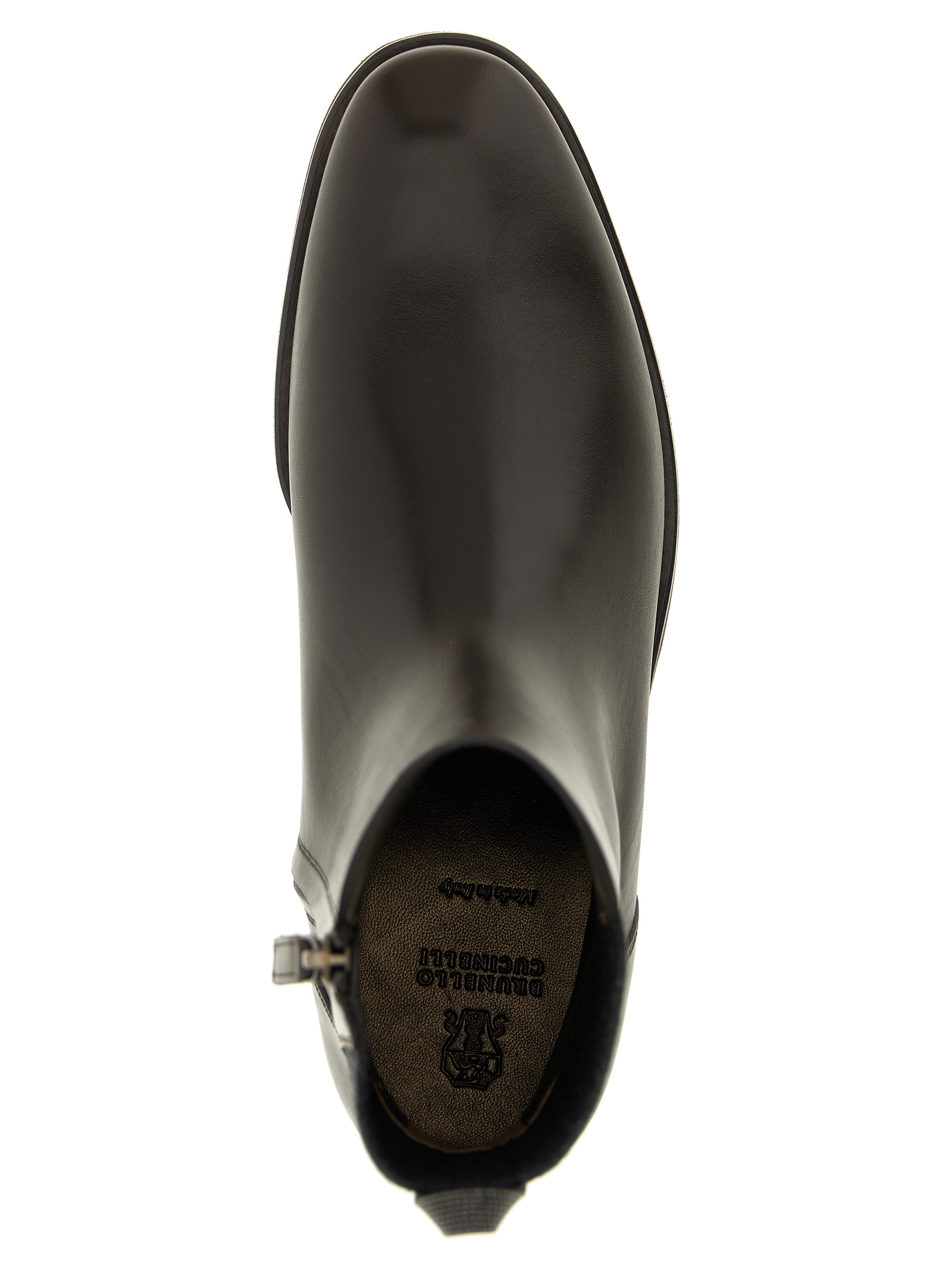 Leather ankle boots, elastic ankle straps, Monile detail on the back, rubber sole.