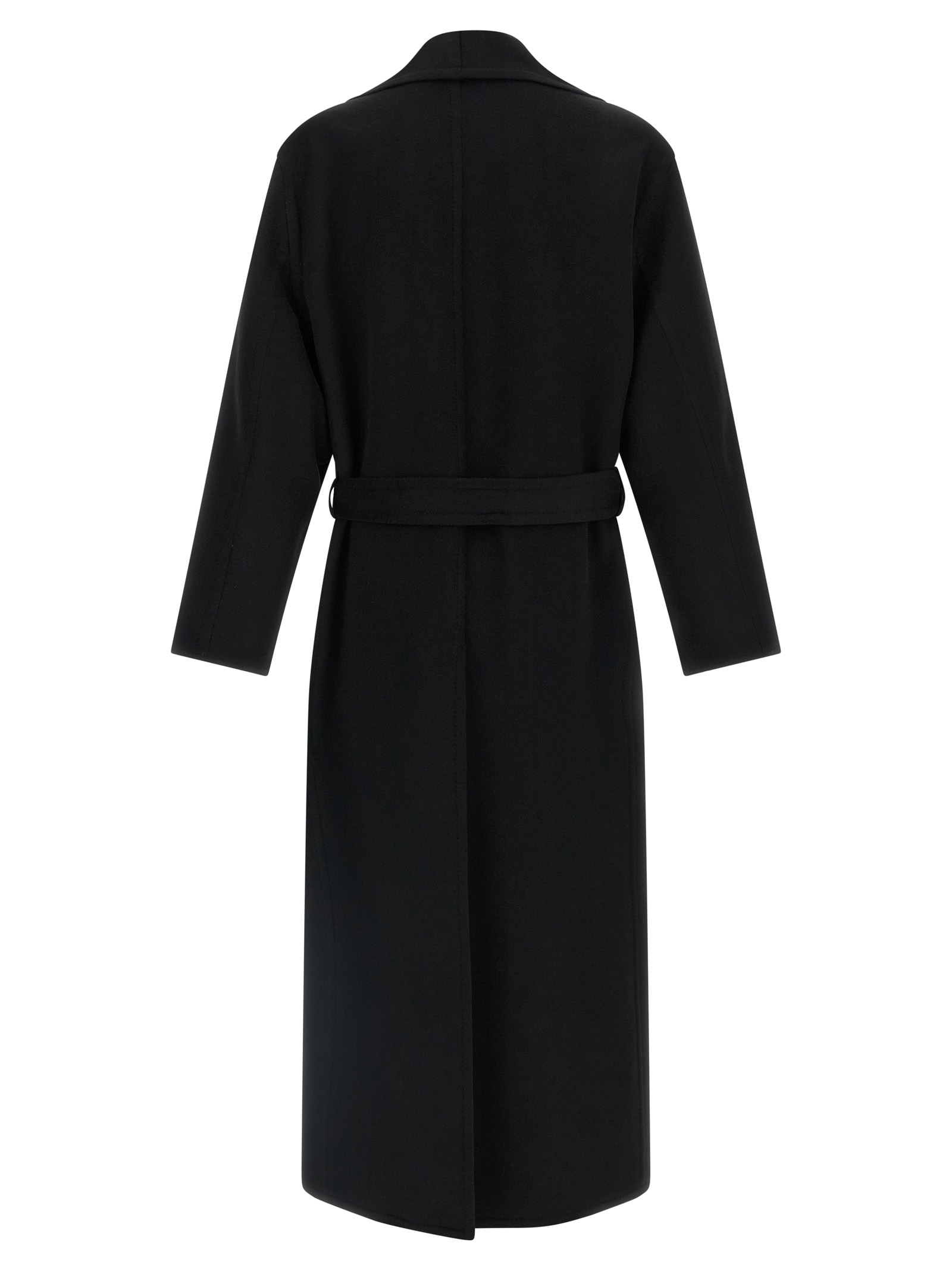 Long coat in wool and double cashmere, unstructured robe model, shawl neck, breast pocket, welt pockets, back split, unlined, removable belt.