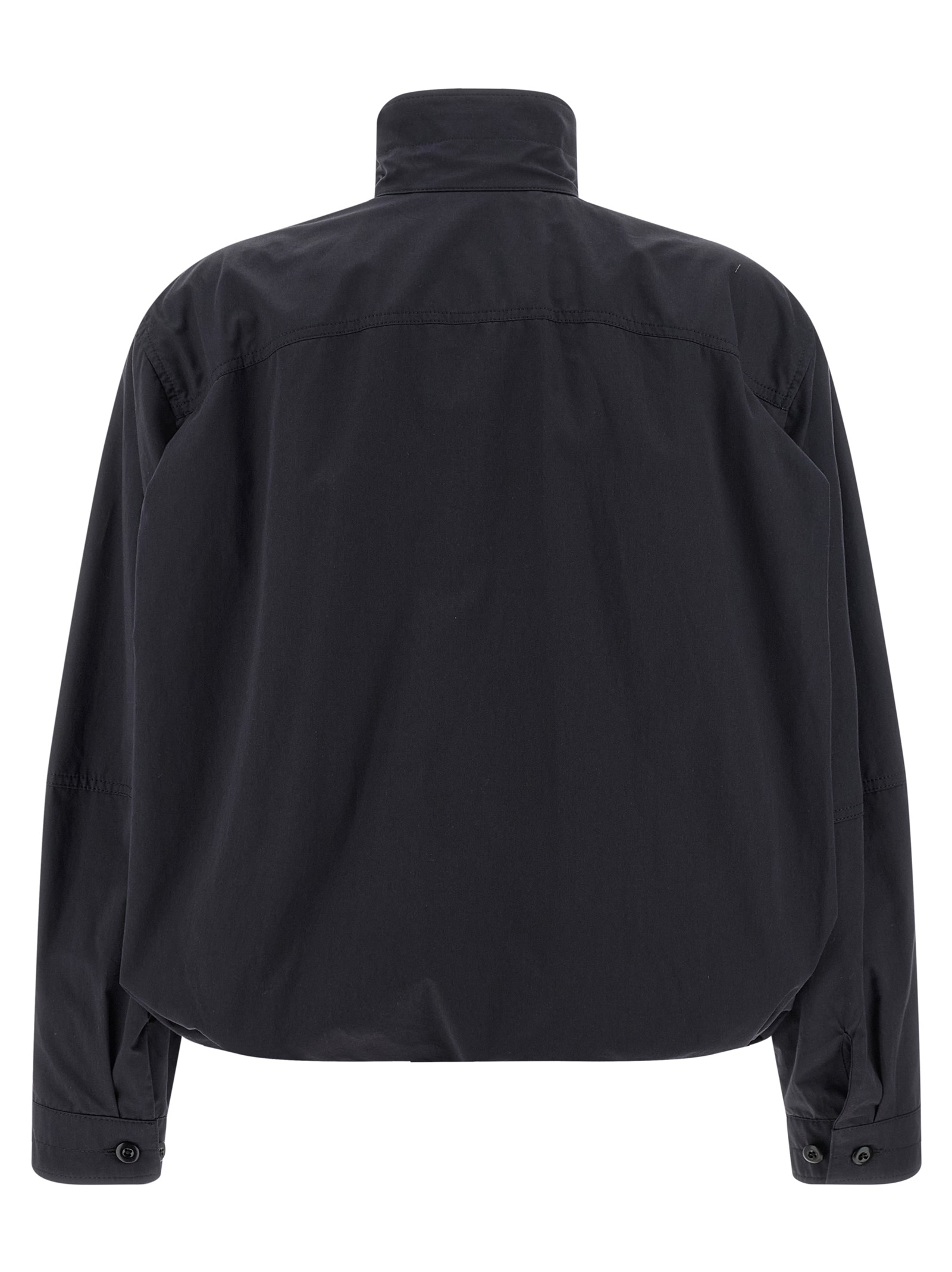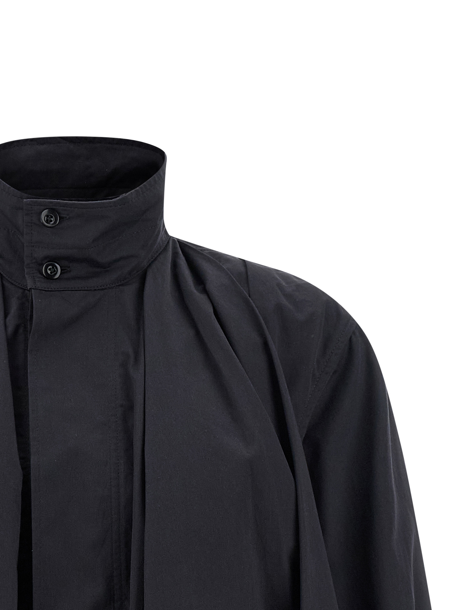 'Soft Pleated' pleated jacket in lightweight cotton satin with front draped effect, structured silhouette with curled hem on the hem, high neck with buttons, hidden front button closure, pockets, long cuffed sleeves.