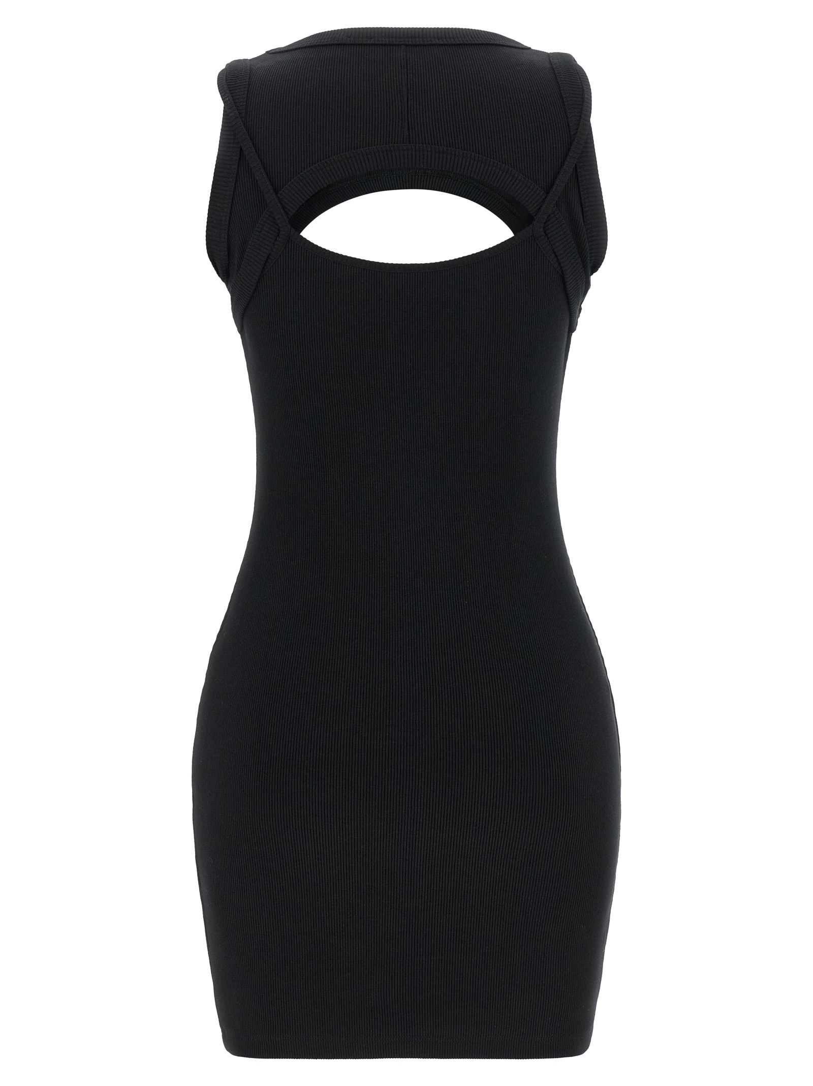 'Off Stamp' ribbed stretch cotton mini dress with double layer upper part with crew neck insert with contrasting logo embroidery, thin straps, sleeveless, round neckline.