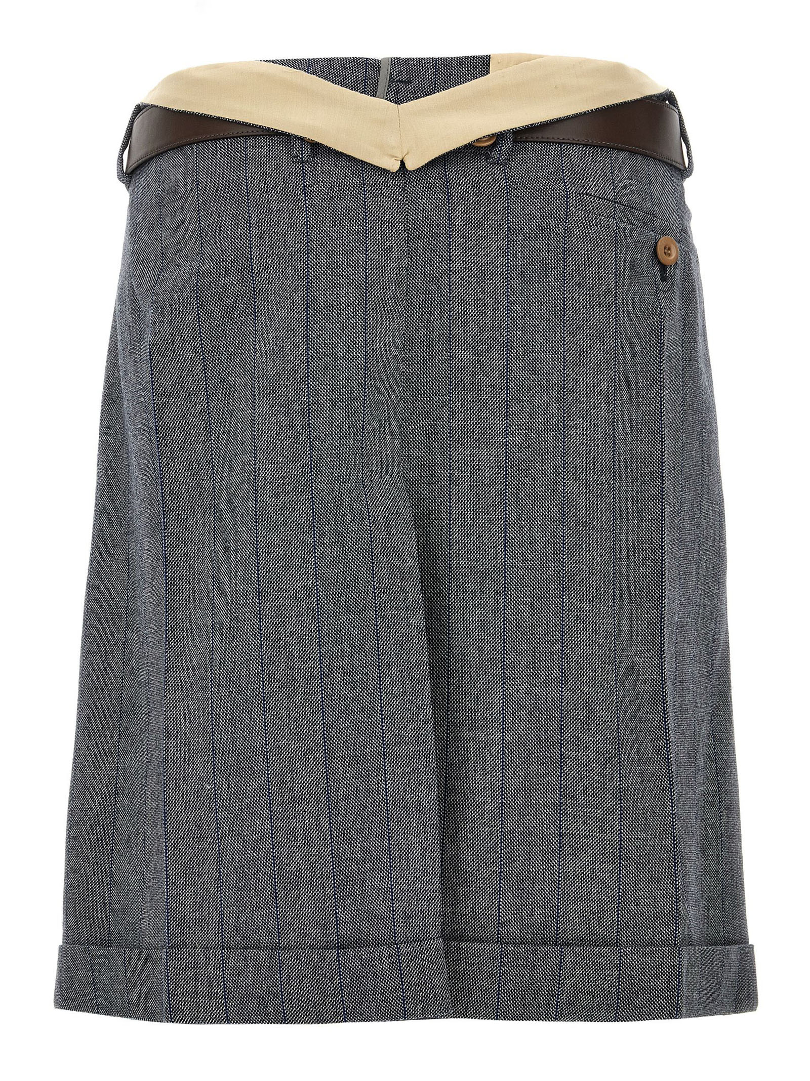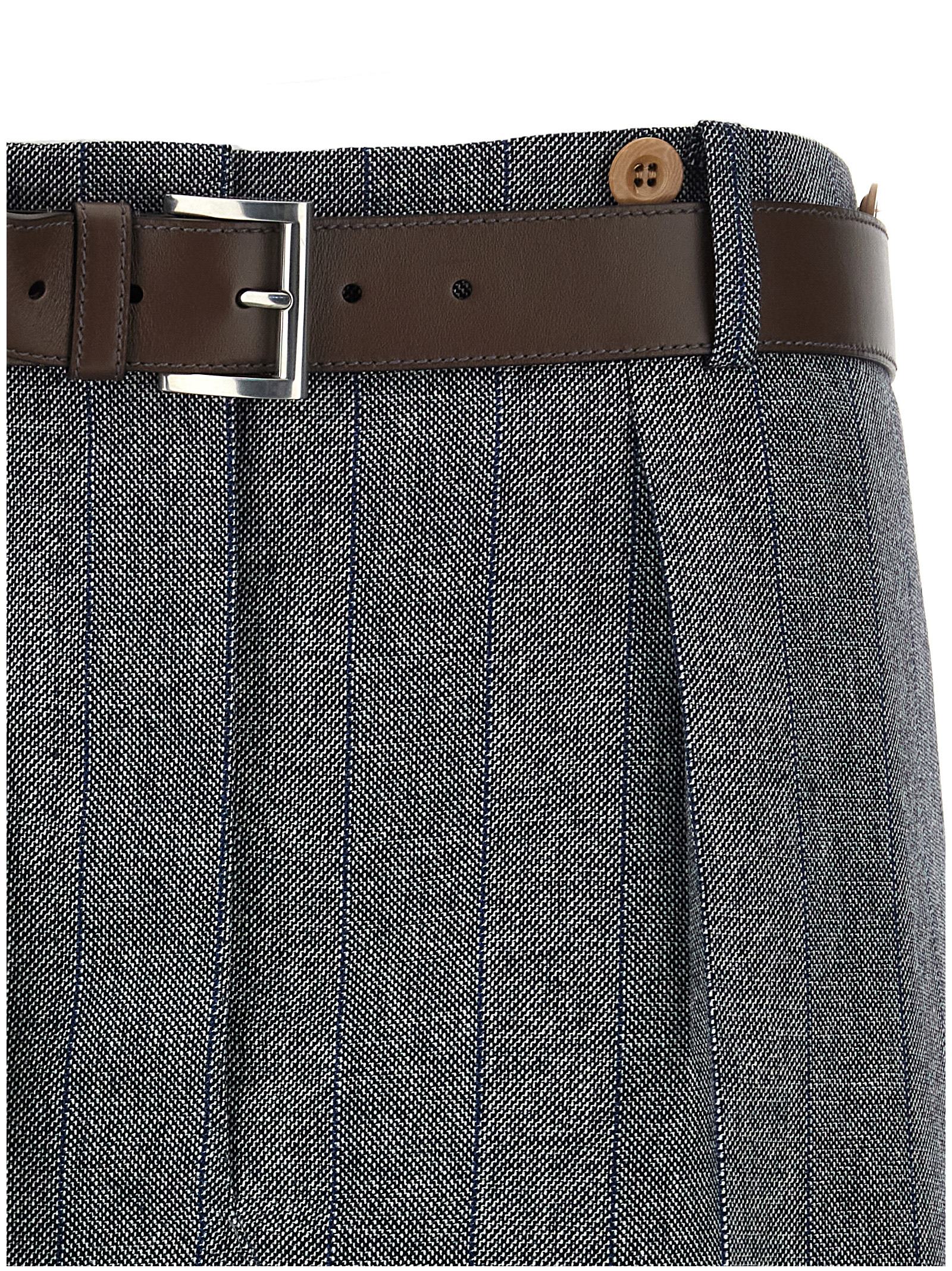 Striped wool skirt, hook and button zip closure, matching leather belt, pockets, turned-up hem.