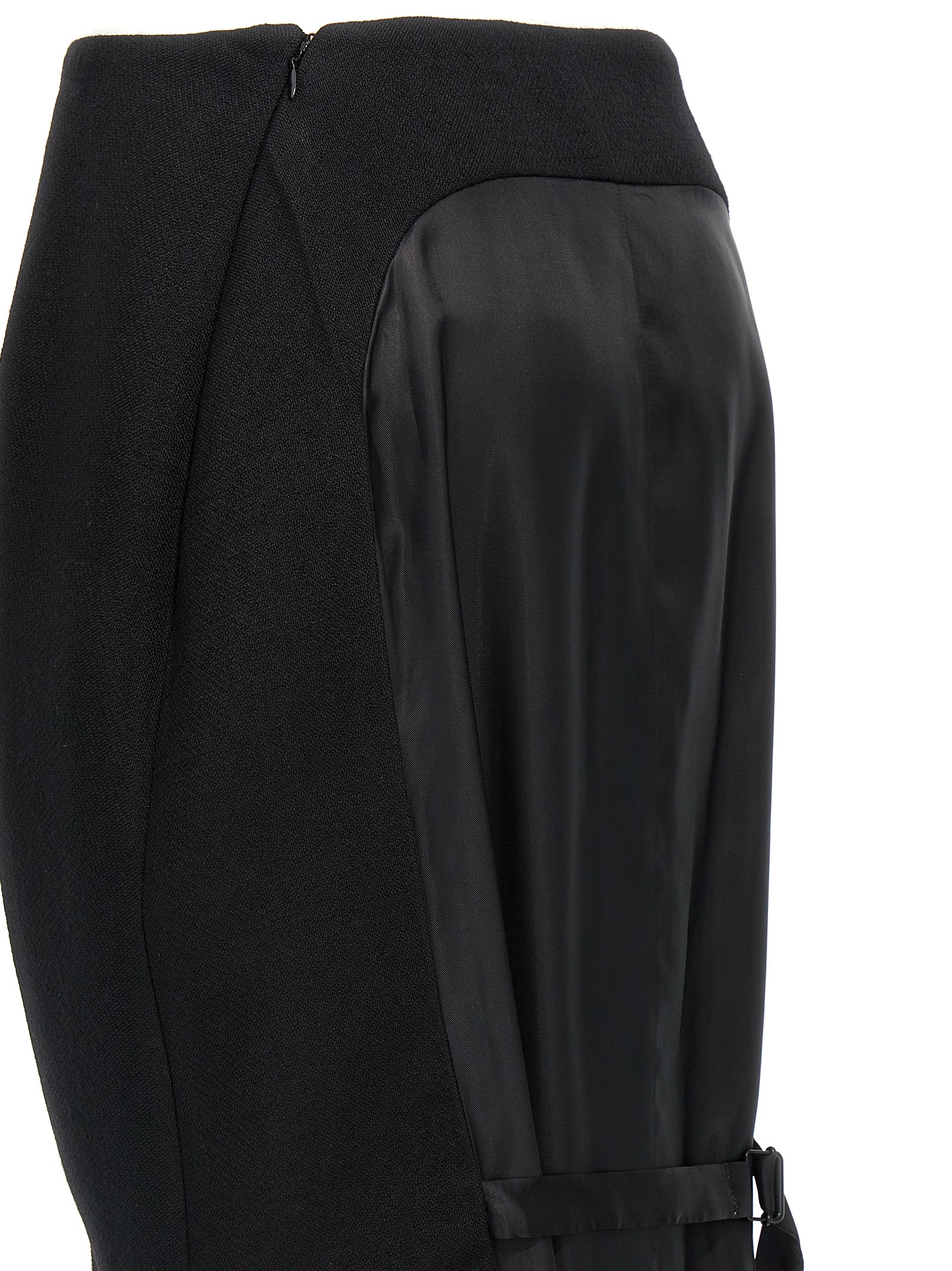 'Stuoia Old' wool skirt with front shots, satin back with adjustable strap, side zip closure.