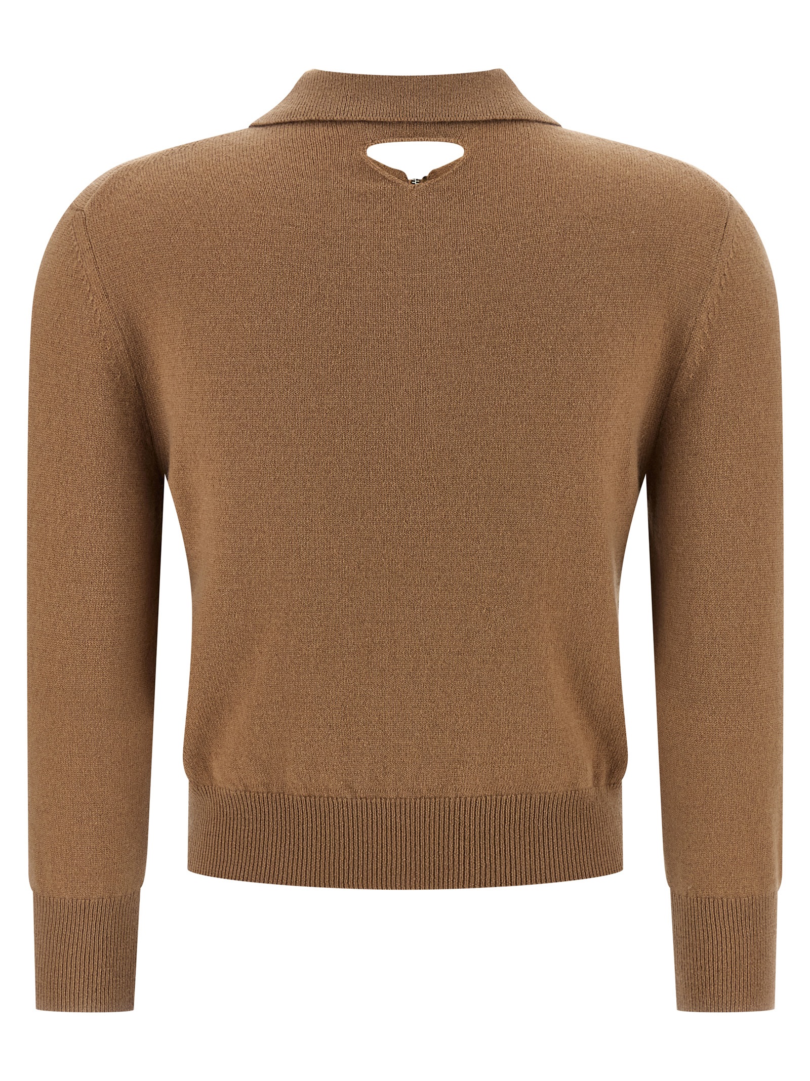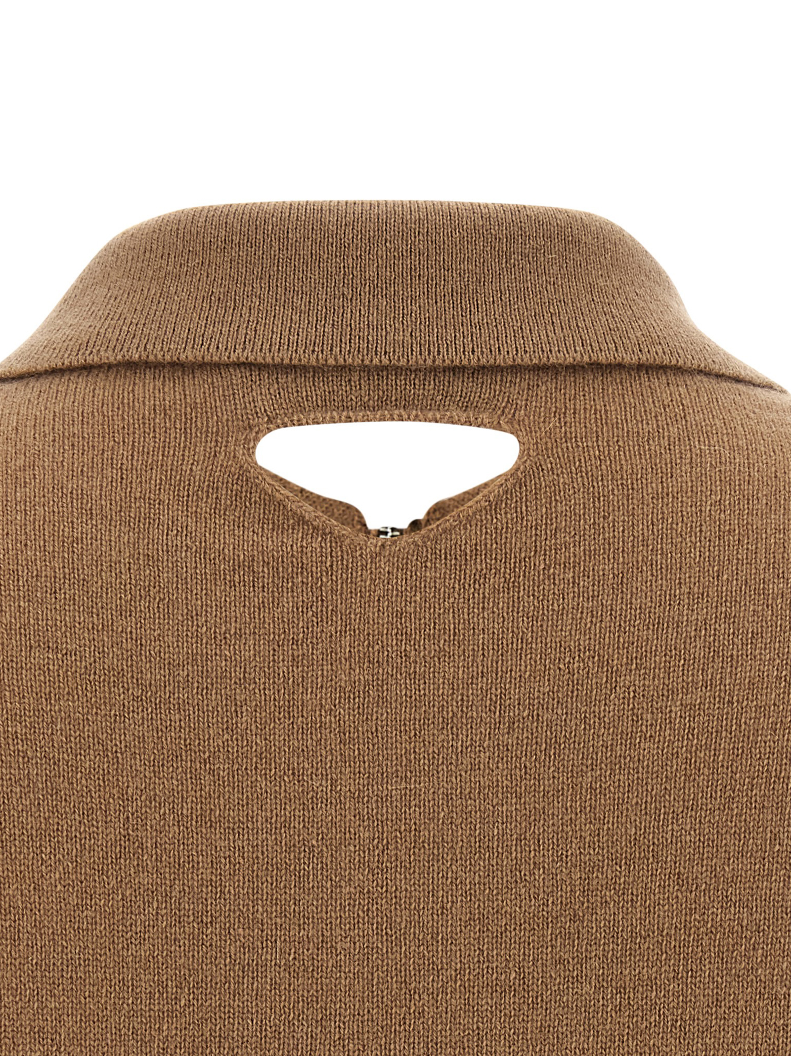 Wool knit polo shirt, collar and zip closure, 3/4 sleeves, cut out back logo detail.