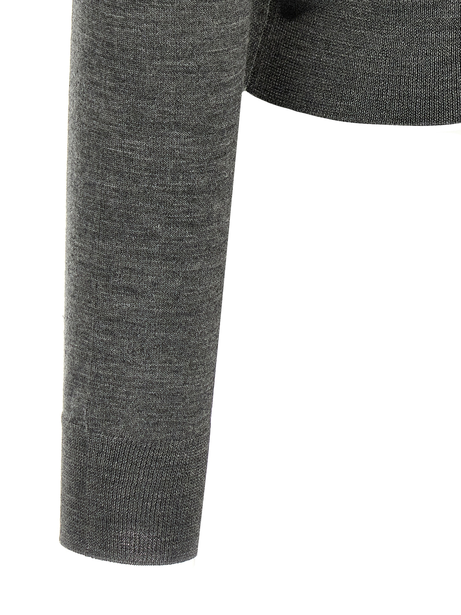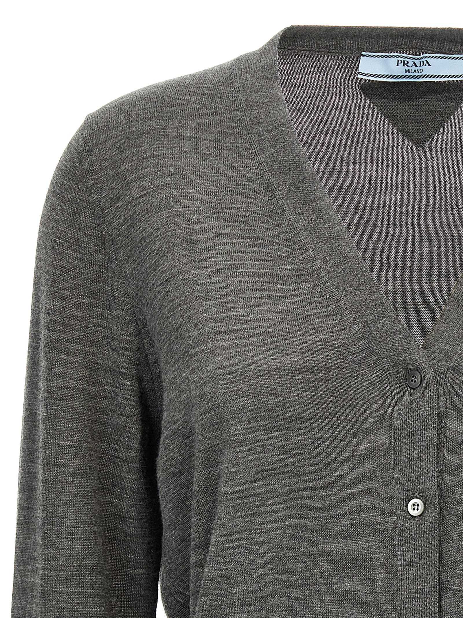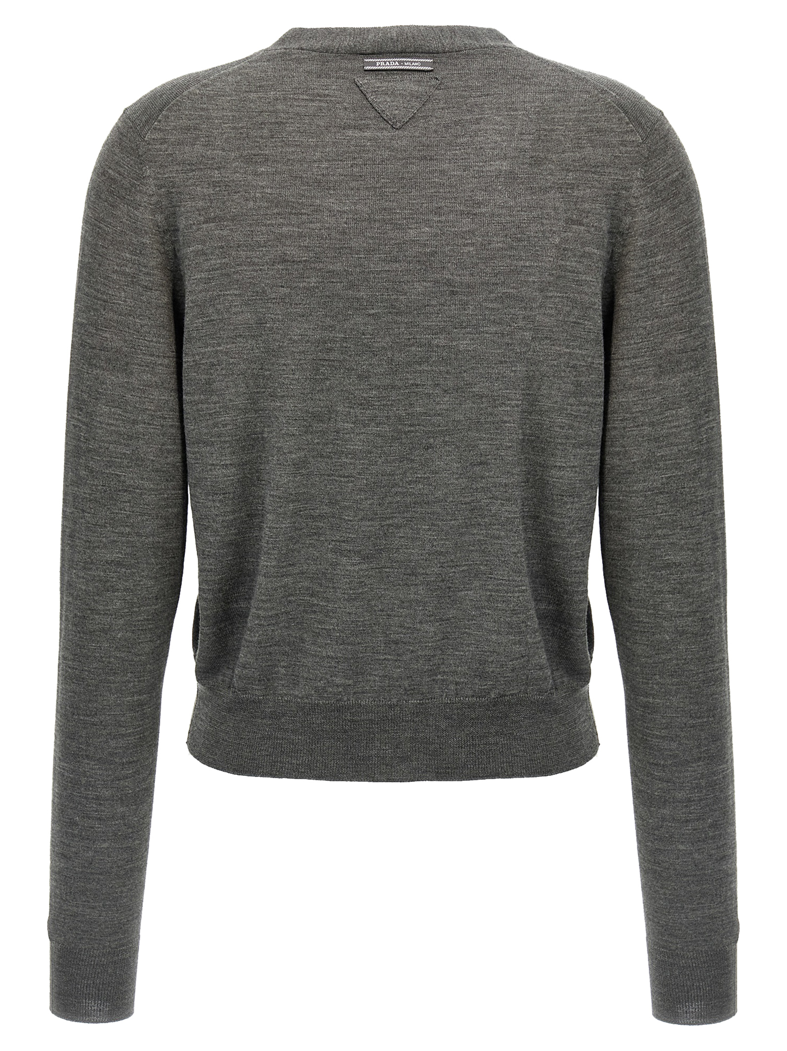 Virgin wool cardigan, triangle logo in tone-on-tone fabric at the back, V-neck, button closure, long cuffed sleeves.
