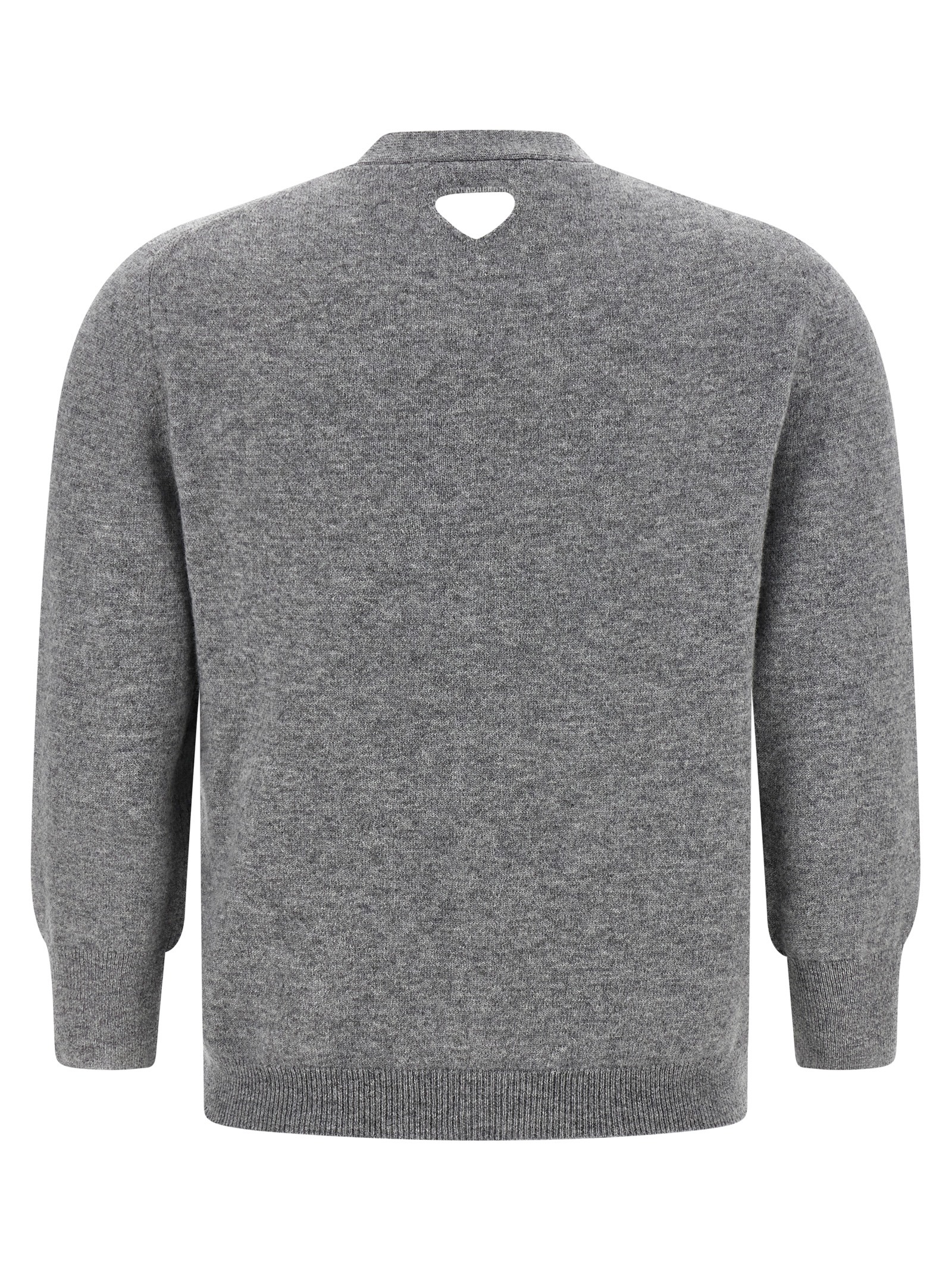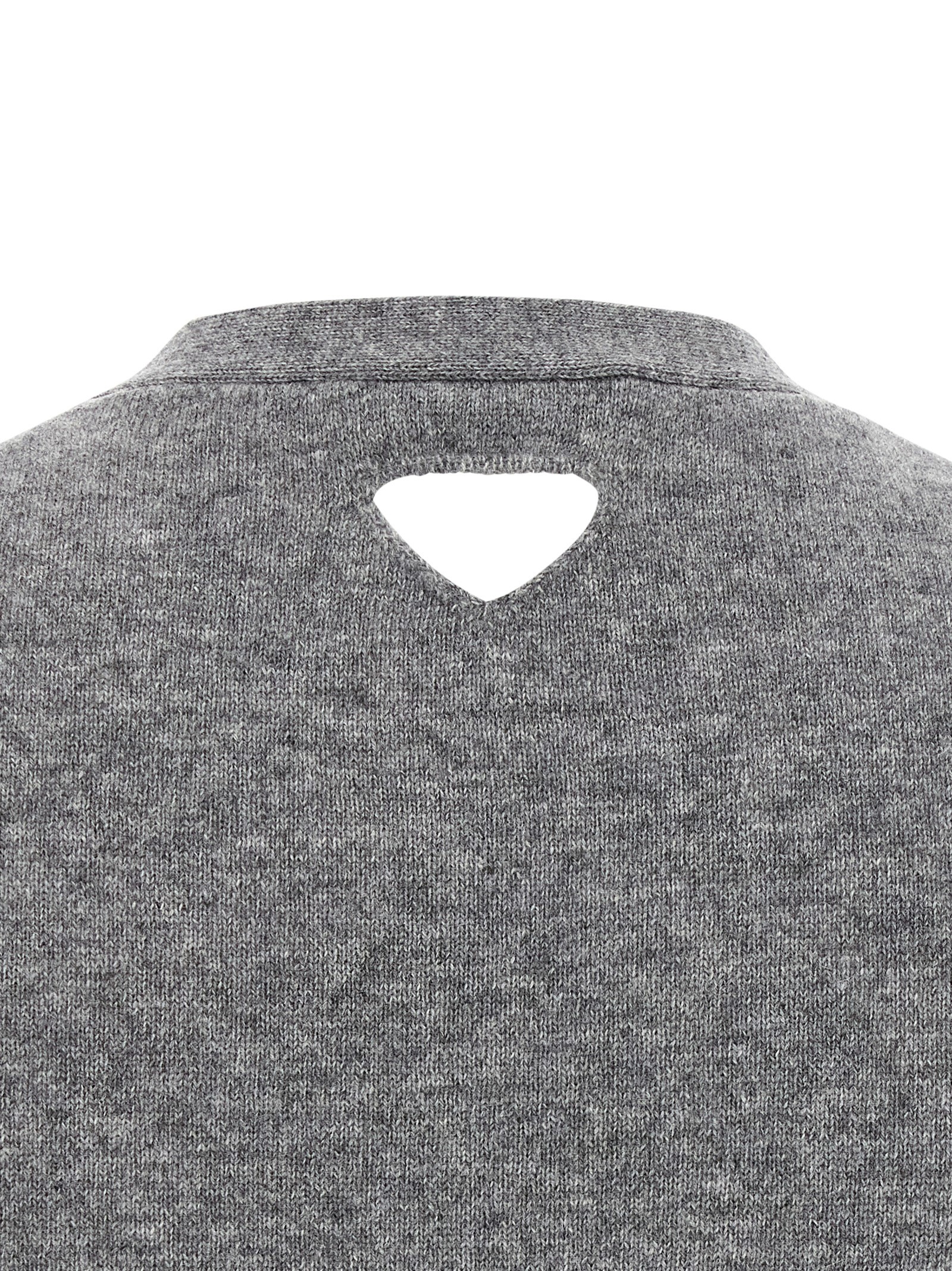 Cashmere cardigan, V-neck, button closure, pockets, cut out logo back detail, long cuffed sleeves.