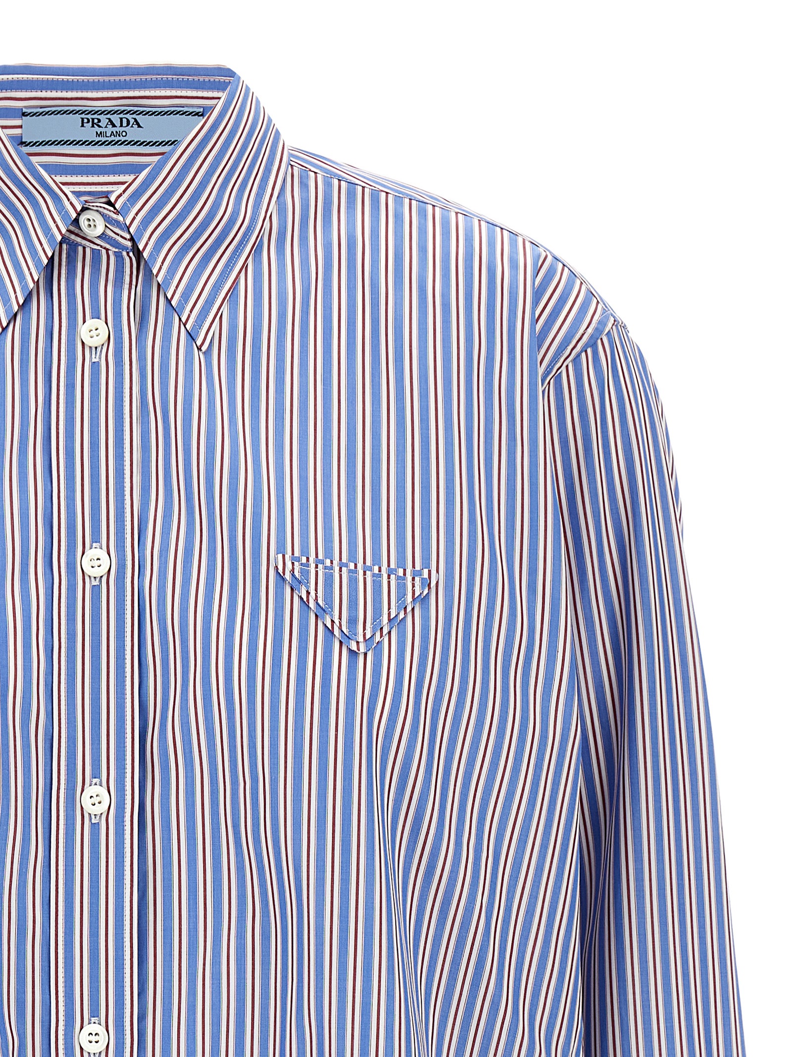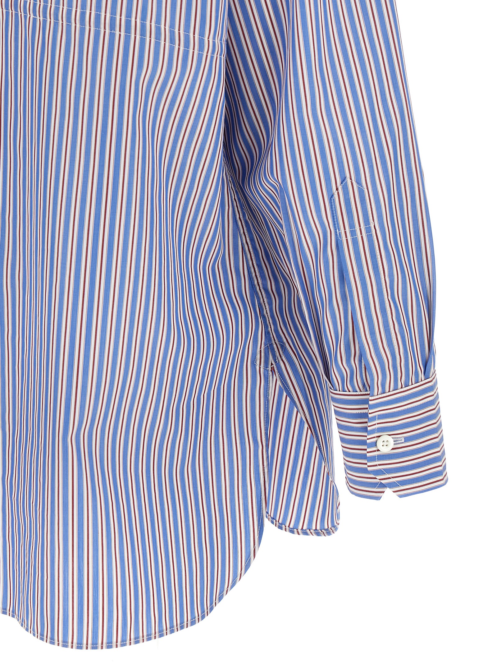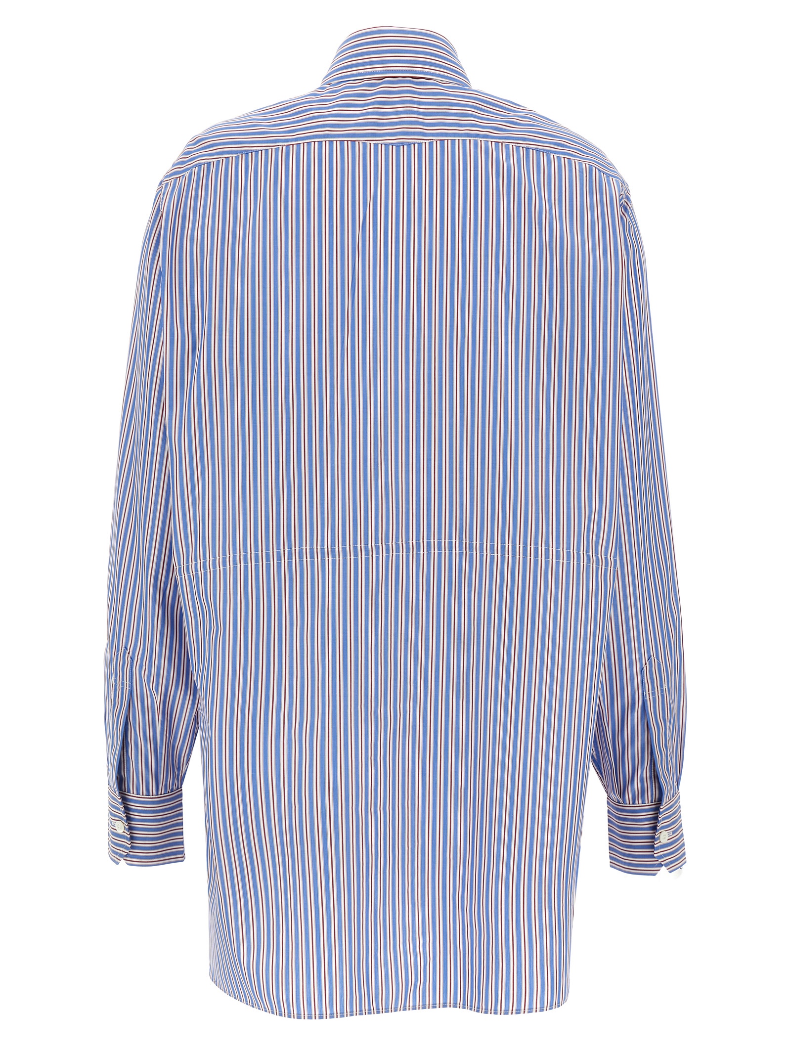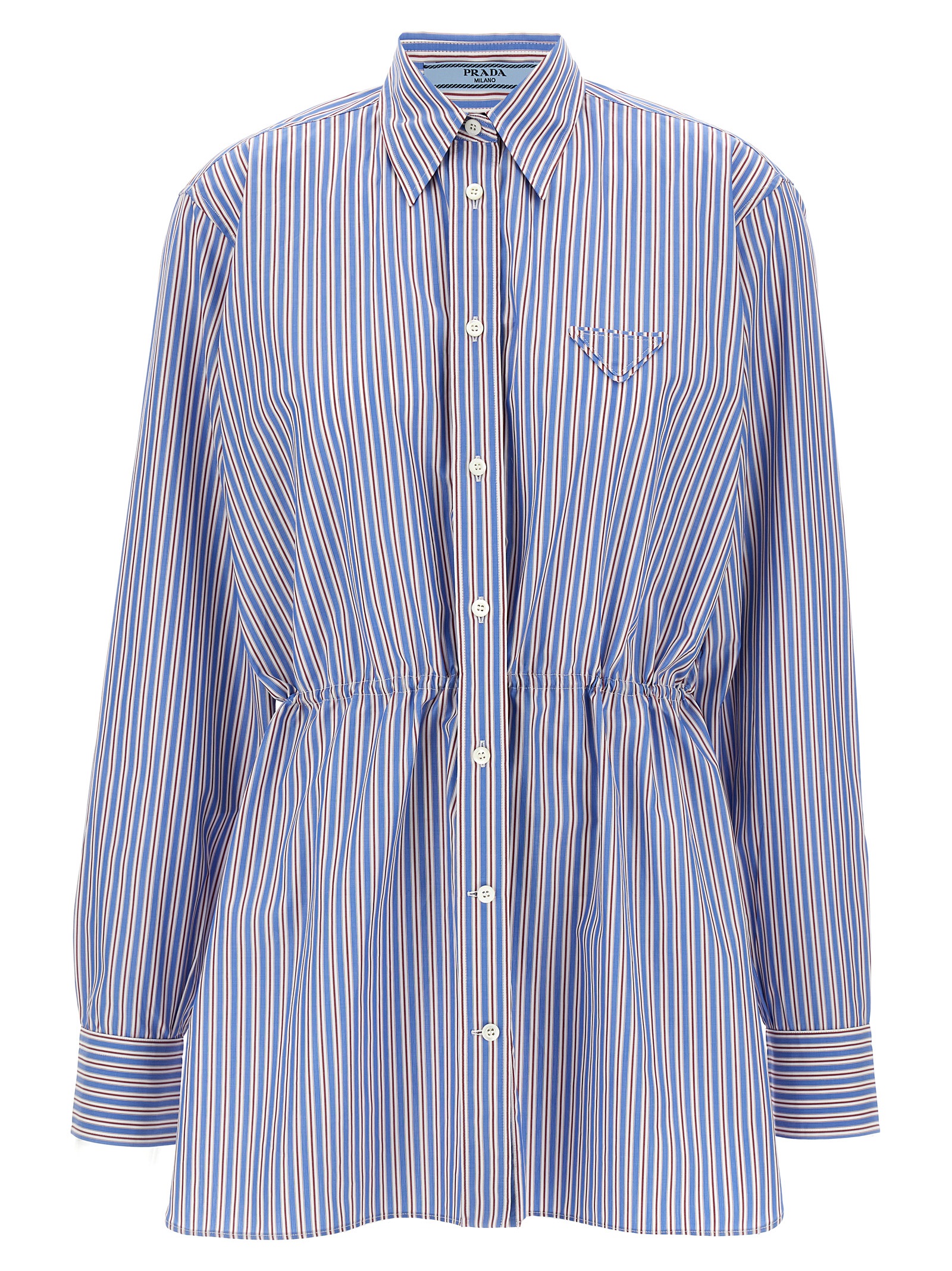 Striped cotton poplin shirt, triangle logo in tone-on-tone fabric on the front, adjustable drawstring at the waist, button closure, long sleeves with cuffs, side slits.