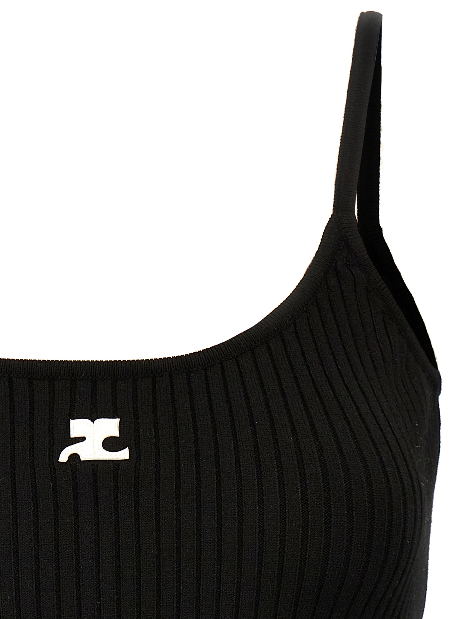 Reedition ribbed knit top with round neckline, thin straps, and front logo patch.