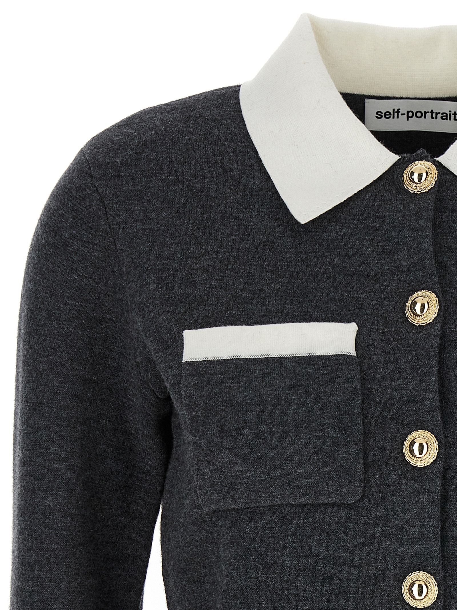 'Grey Contrast Collar' cardigan in stretch wool and cashmere blend with contrast details, shirt collar, front button closure, pockets, long cuffed sleeves.
