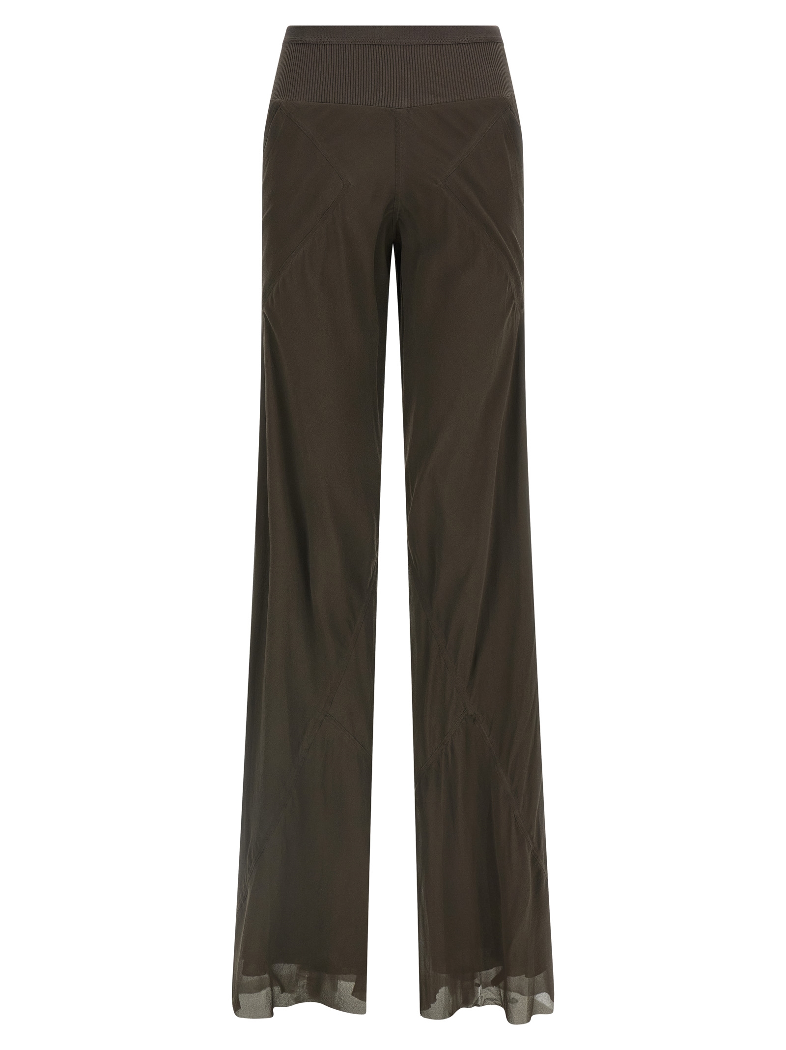 'Bias' silk trousers, lining, ribbed elastic waistband, pockets, flared wide leg, raw cut hem on the leg bottom.