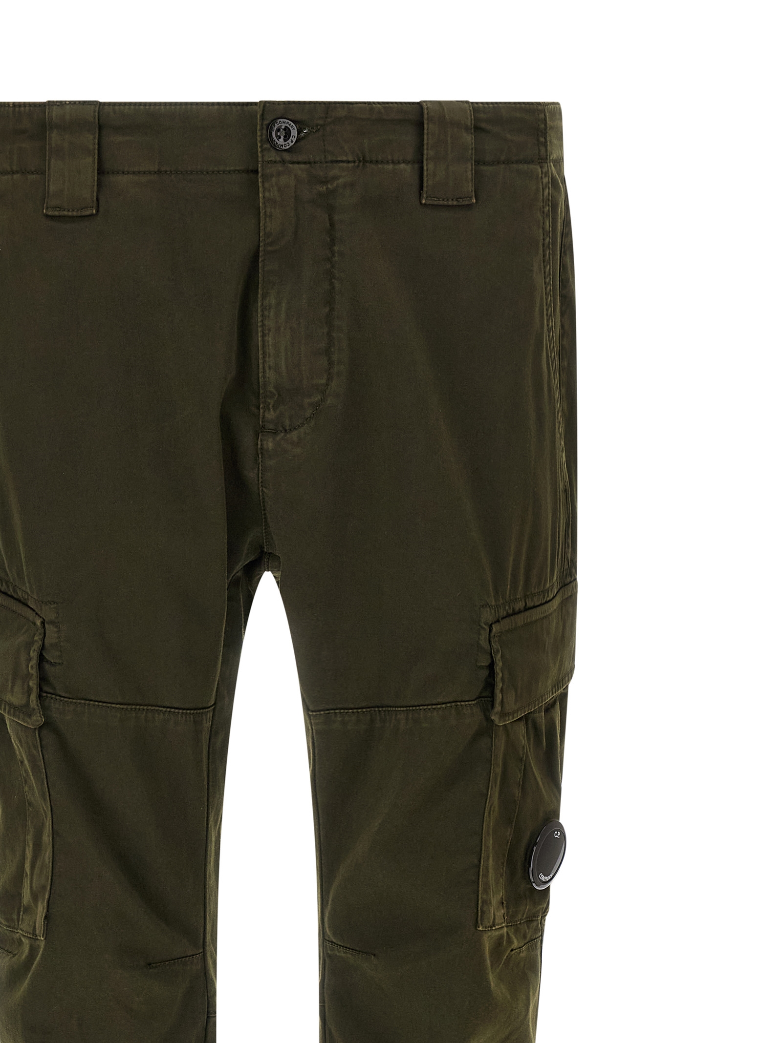 Garment-dyed sanded stretch cotton satin trousers, cargo model with side lens, zip and front button closure, pockets.