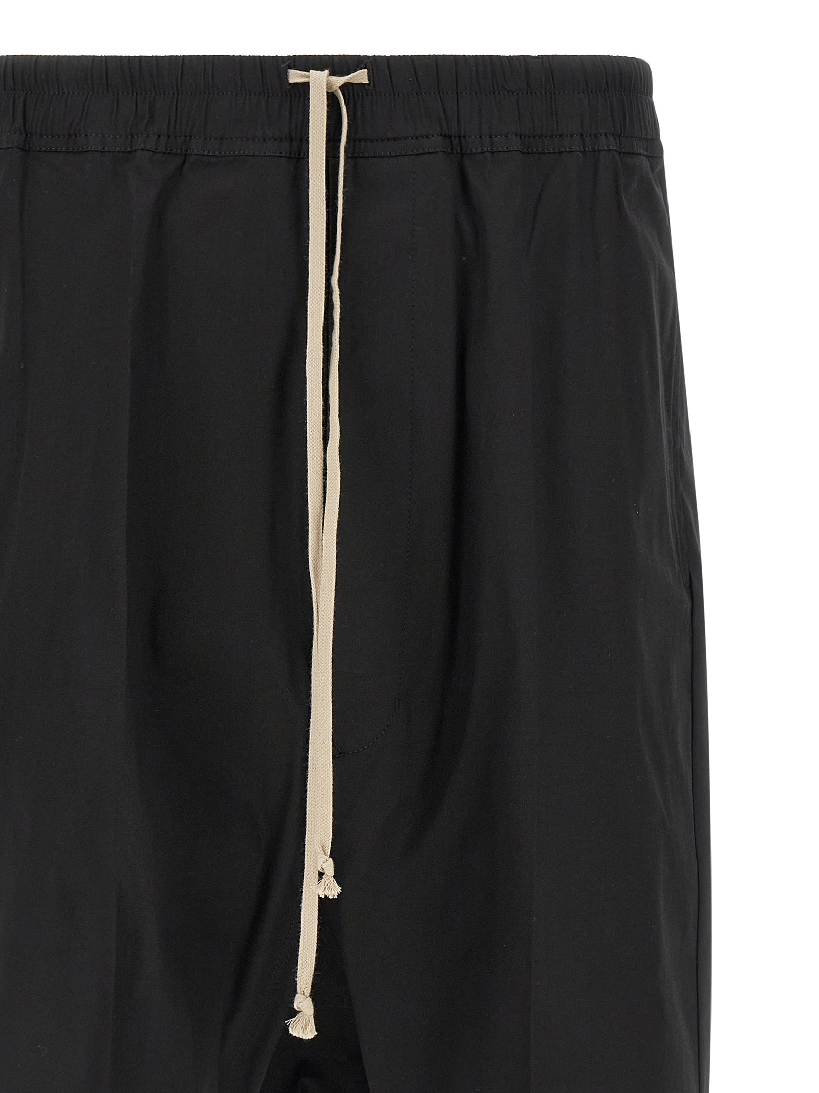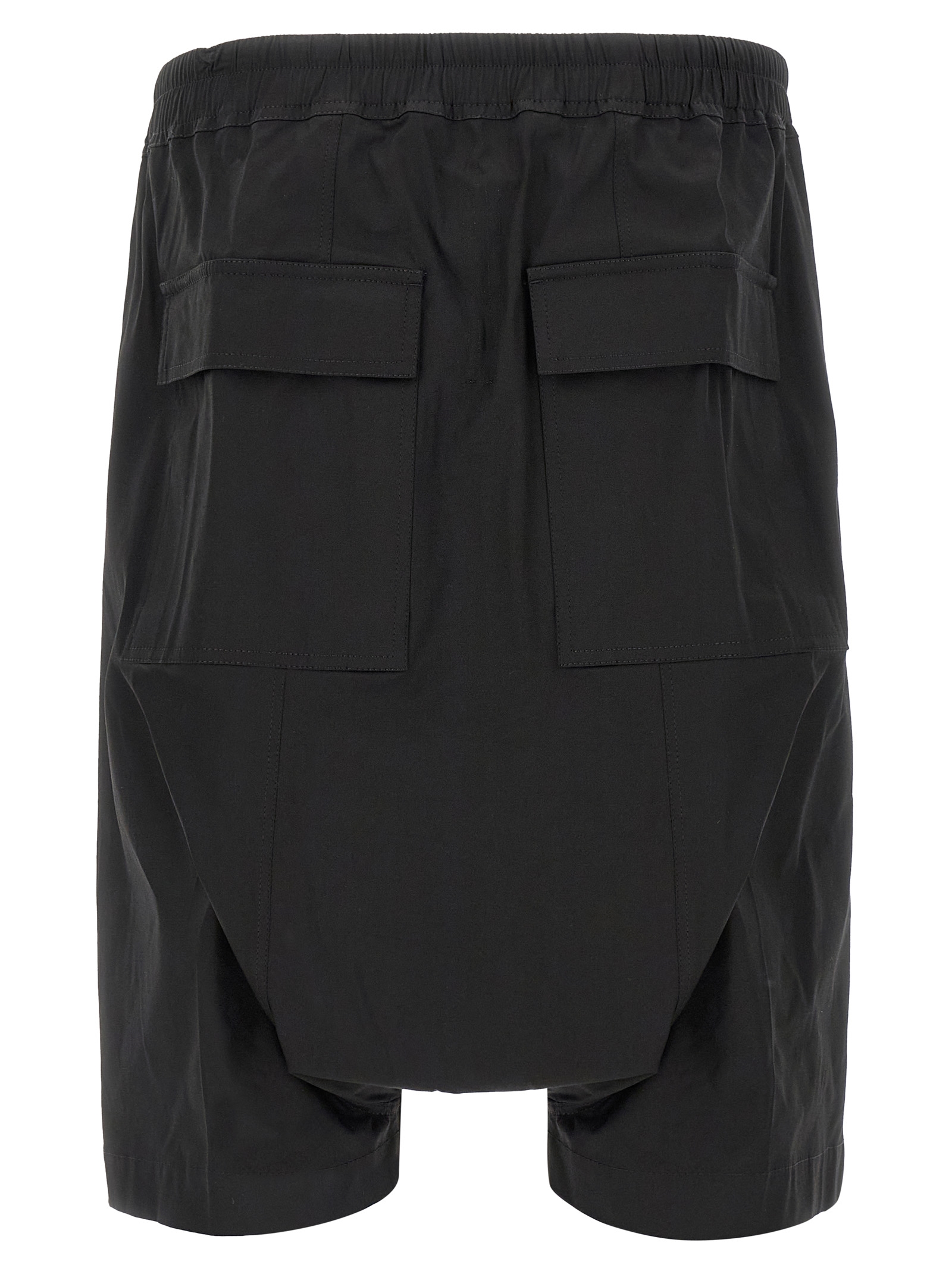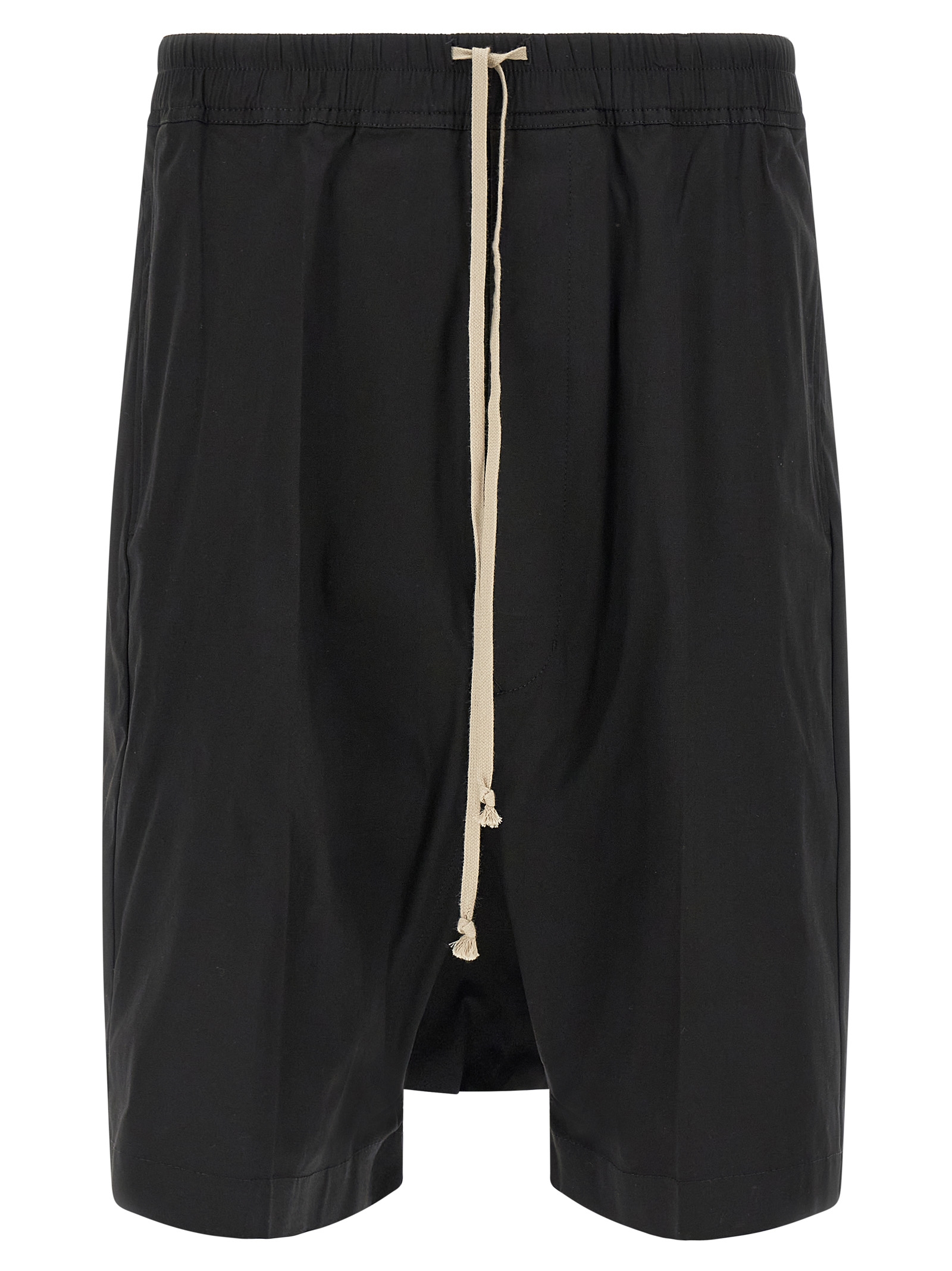 'Rick S Pods' bermuda shorts in cotton poplin with crunchy average coat weight, low crotch, drawstring elastic waistband, button flap, pockets.