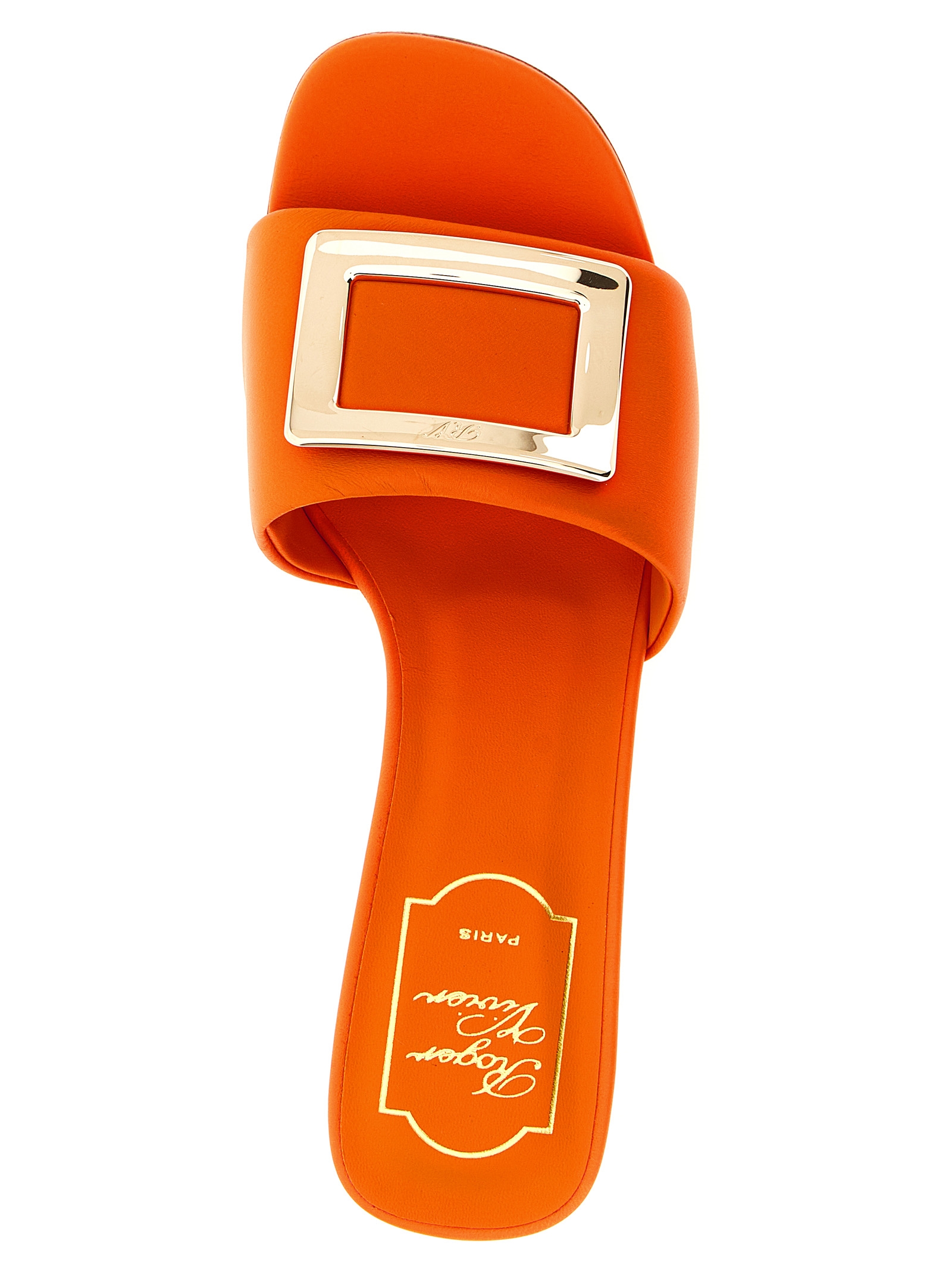 Padded nappa leather slides, band with front metal 'Belle Vivier' buckle, heel, leather sole.