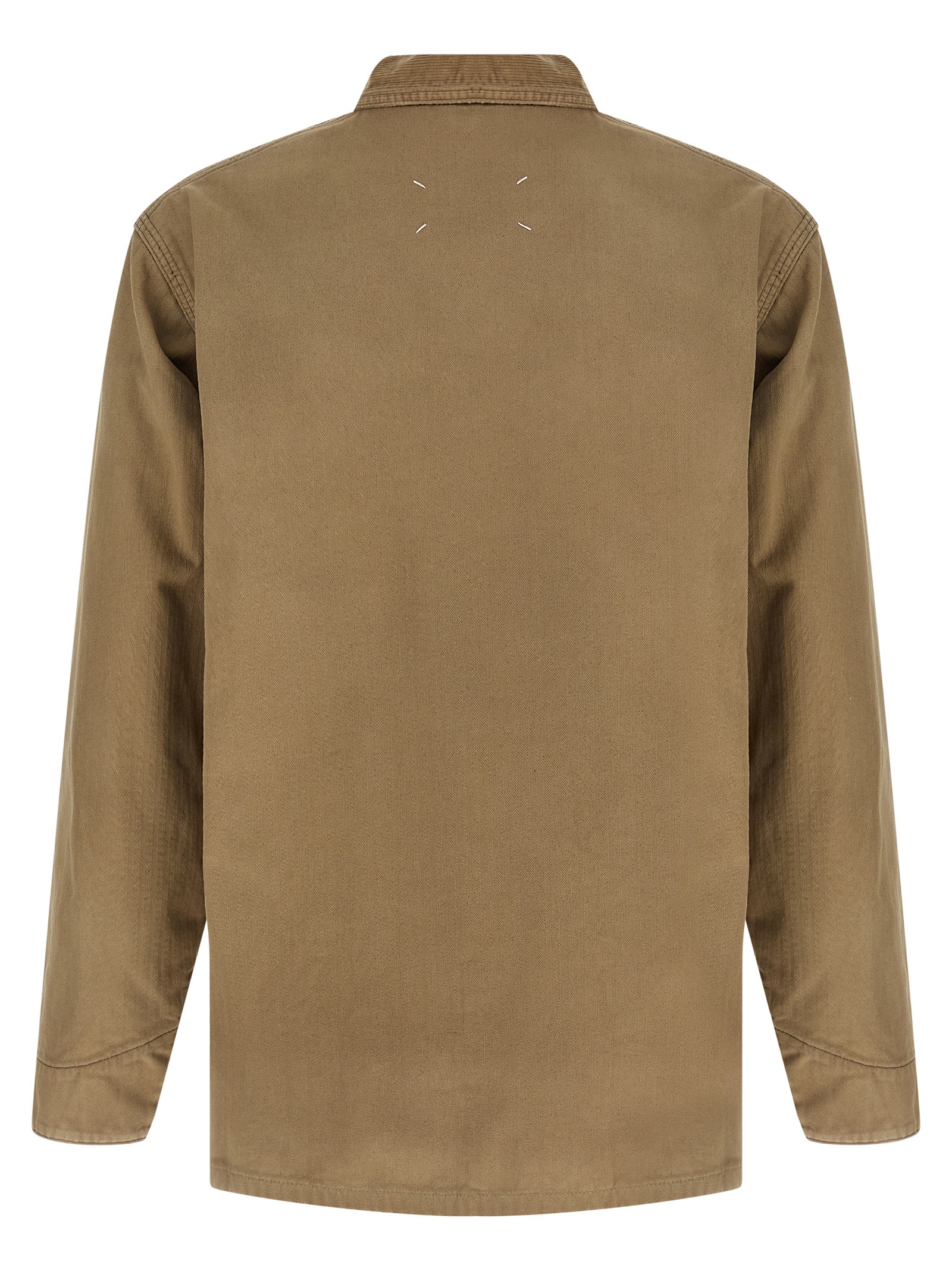 Used-effect herringbone cotton canvas jacket, check cotton lining, corduroy collar, front button closure, pockets, long sleeves with adjustable cuffs.
