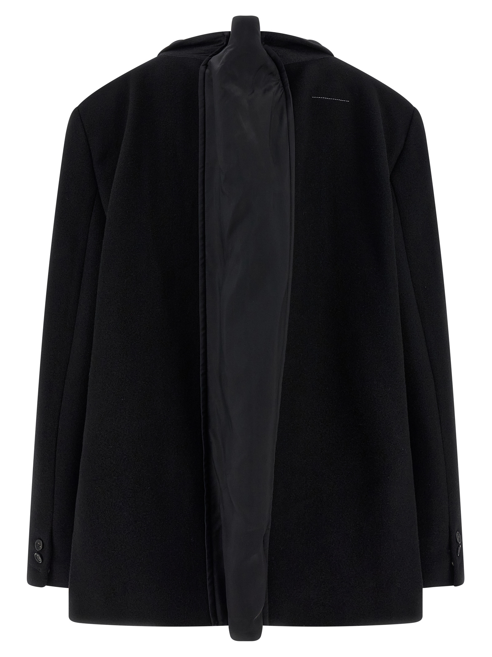 Single-breasted wool blazer with front button closure, mirror lapels, chest pocket, patch pockets, extra padded shoulder strap, long sleeves, tone-on-tone fabric back panel to adjust the width, and 'White stitch line' at the back.