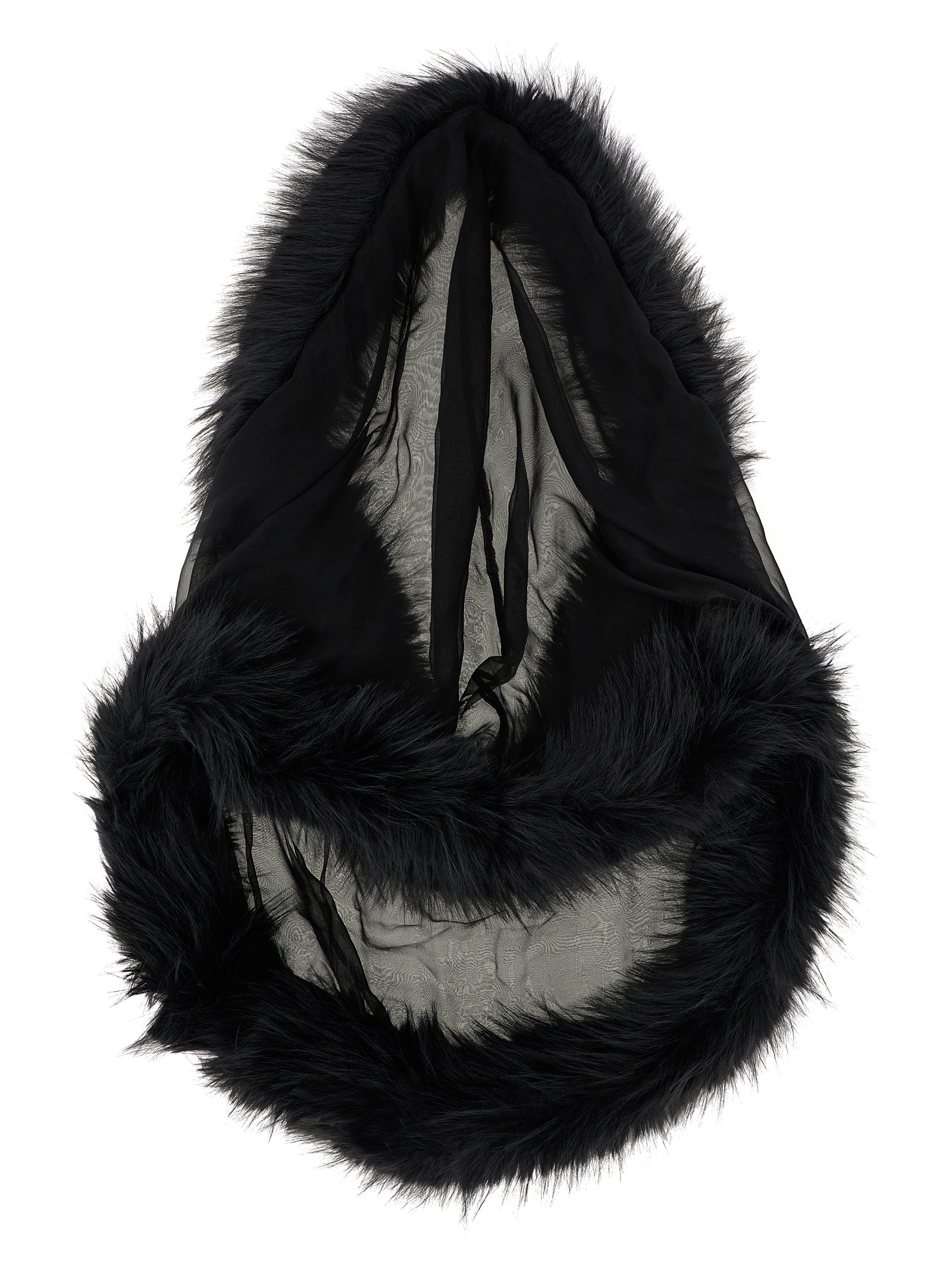 Silk chiffon hooded collar with long-haired fur-effect fabric piping.