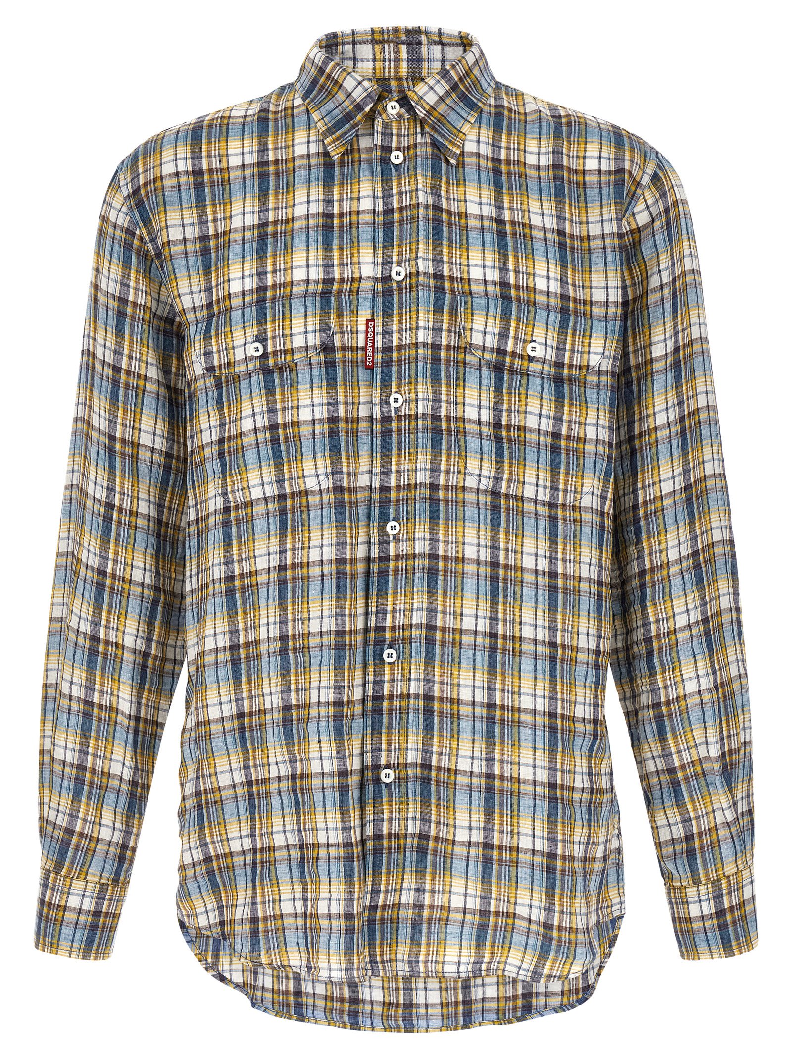 'Canadian Vintage' plaid linen shirt with pointed collar, pockets, front button closure, long sleeves with cuffs and dropped shoulders, rounded hem.