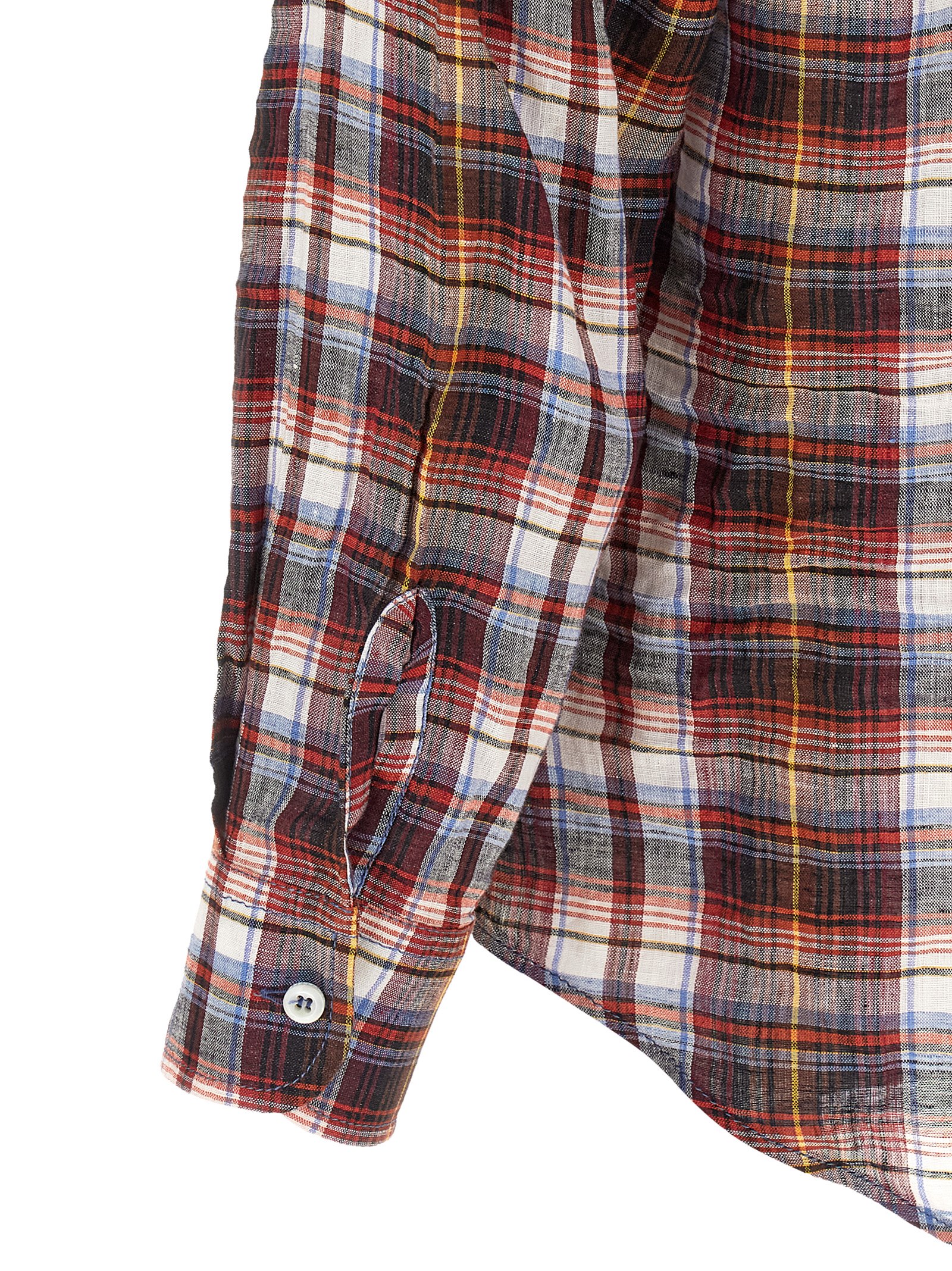 'Canadian Vintage' plaid linen shirt with pointed collar, pockets, front button closure, long sleeves with cuffs and dropped shoulders, rounded hem.