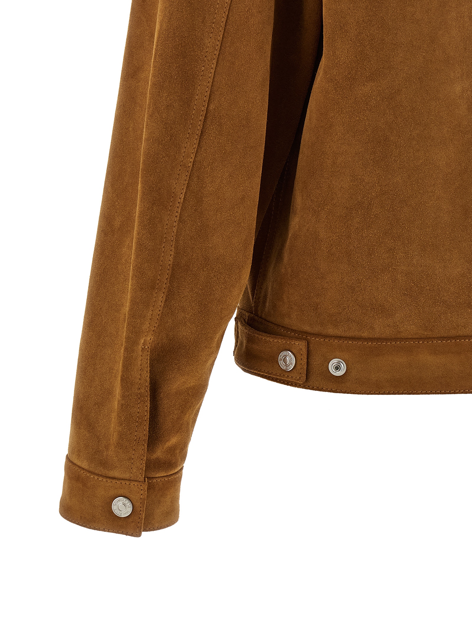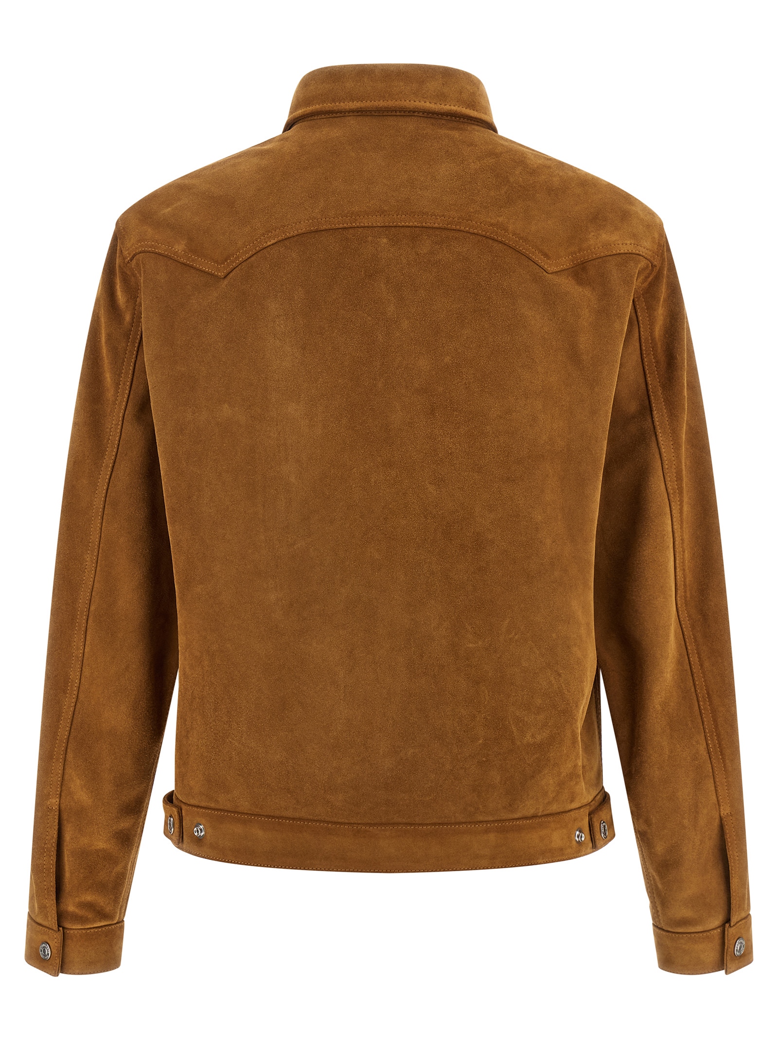 'Suede Boxy Shirt' suede jacket with Western style shirt style, front snap button closure, pockets, long cuffed sleeves, unlined.