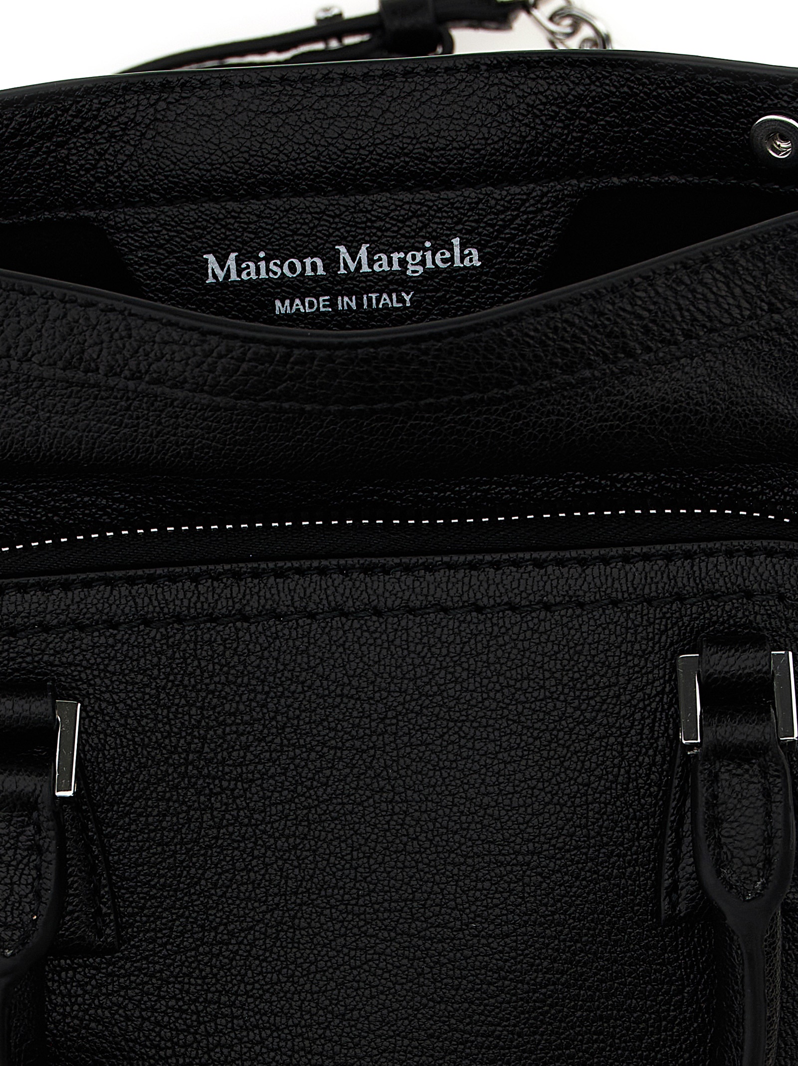 Micro '5AC Classique' goat leather handbag, folded closure with zip and 'Numeric signature MM6' patch, double fixed handle, back 'Four stitches', chain shoulder strap with removable leather protection.