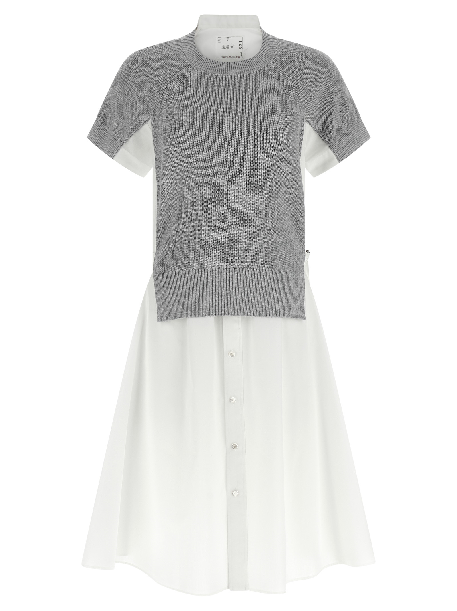 Hybrid midi dress consisting of flared cotton poplin body with front button closure, short sleeves, removable belt and contrasting knitted cotton blend front and a crewneck.