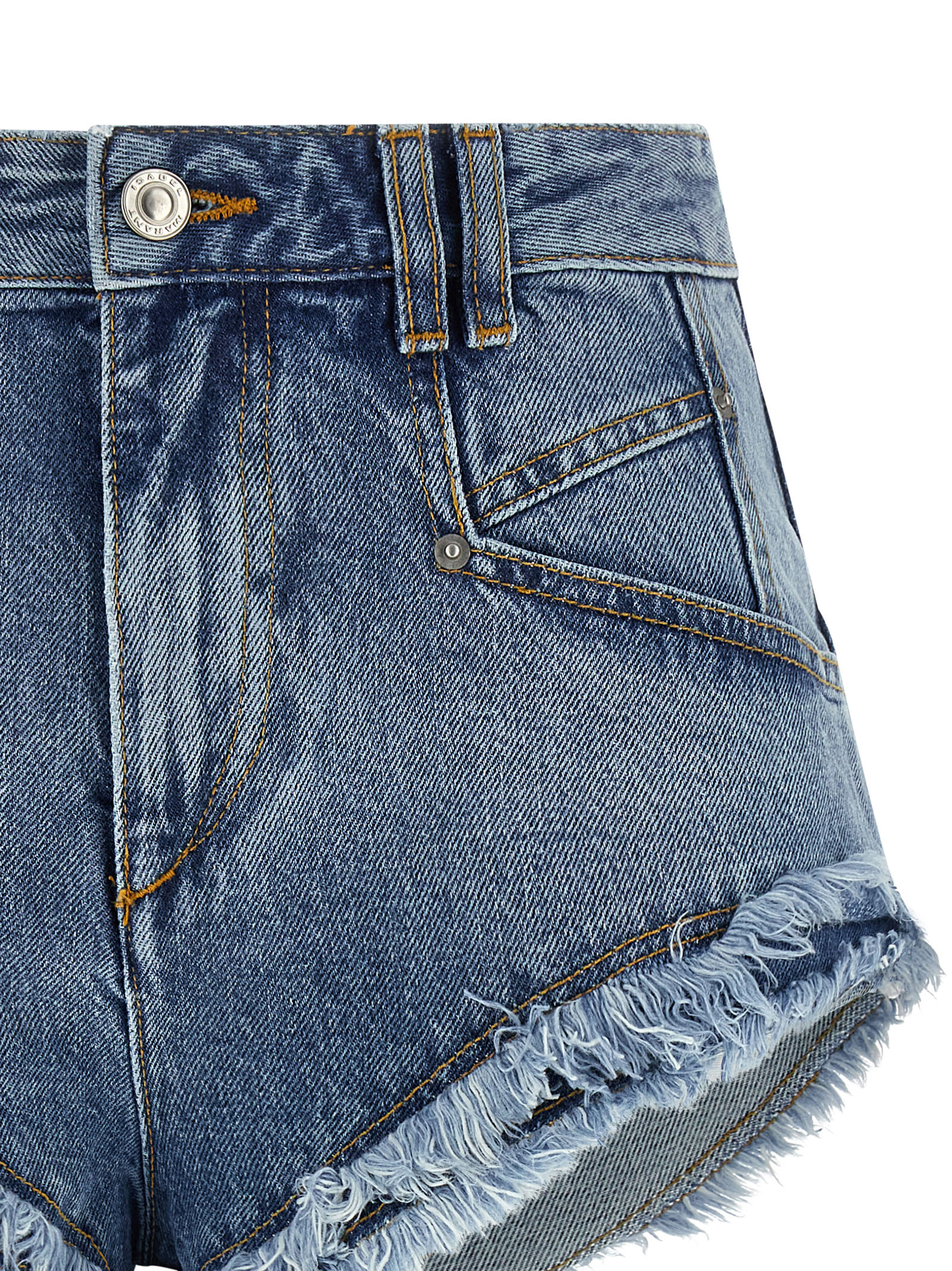 'Eneidala' cotton denim shorts with contrast stitching, front zip and button closure, pockets, frayed hem, leather logo label at the back.