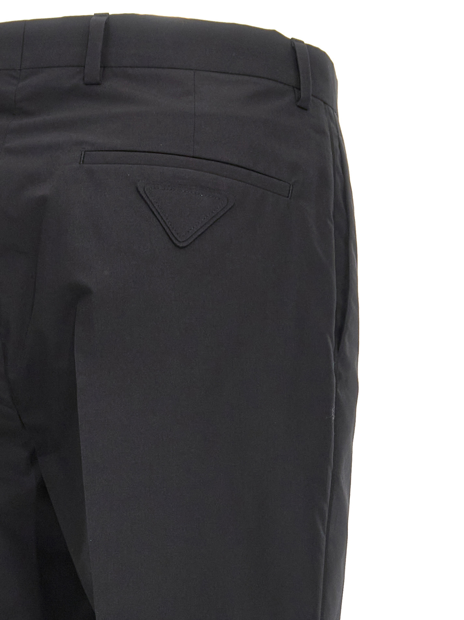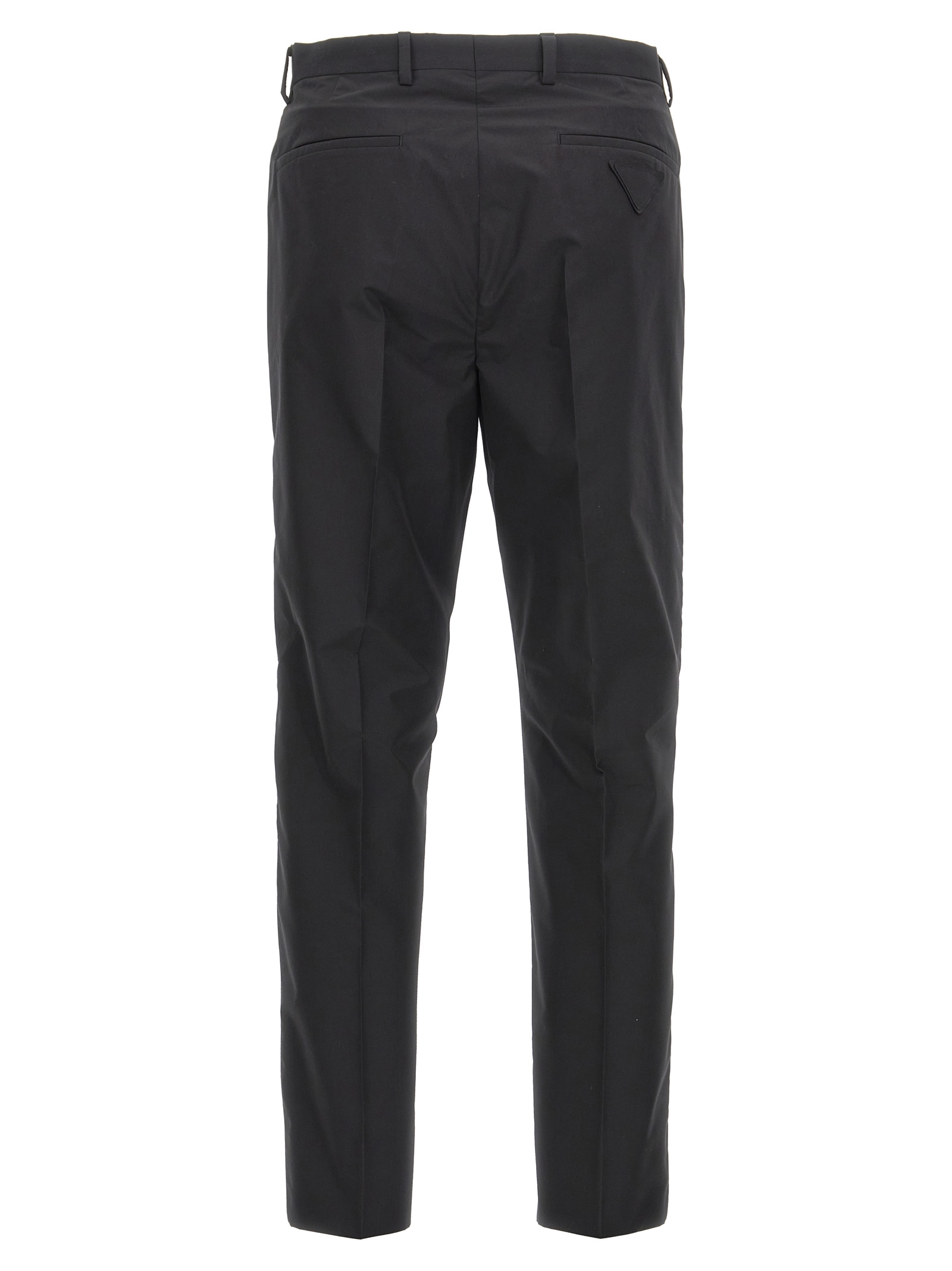 Technical cotton pants, tone-on-tone triangle logo patch on back, narrow leg with ironed crease, zipper and button closure, pockets.
