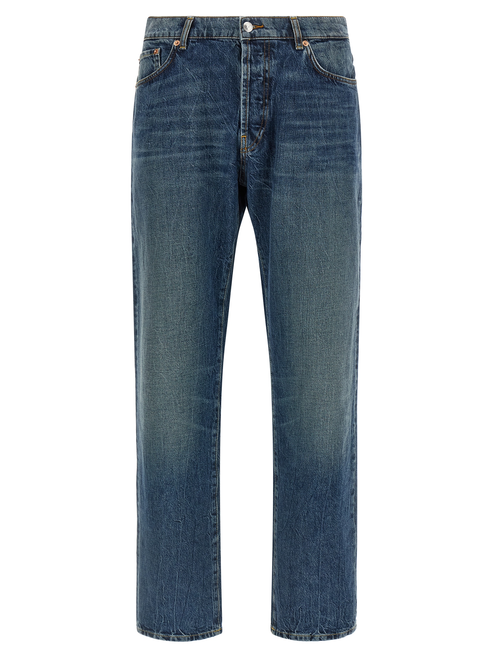 Bowl' stone-washed 13 1/4 oz non-stretch cotton denim jeans with contrast stitching, straight leg, front button closure, five pockets, back logo tag.