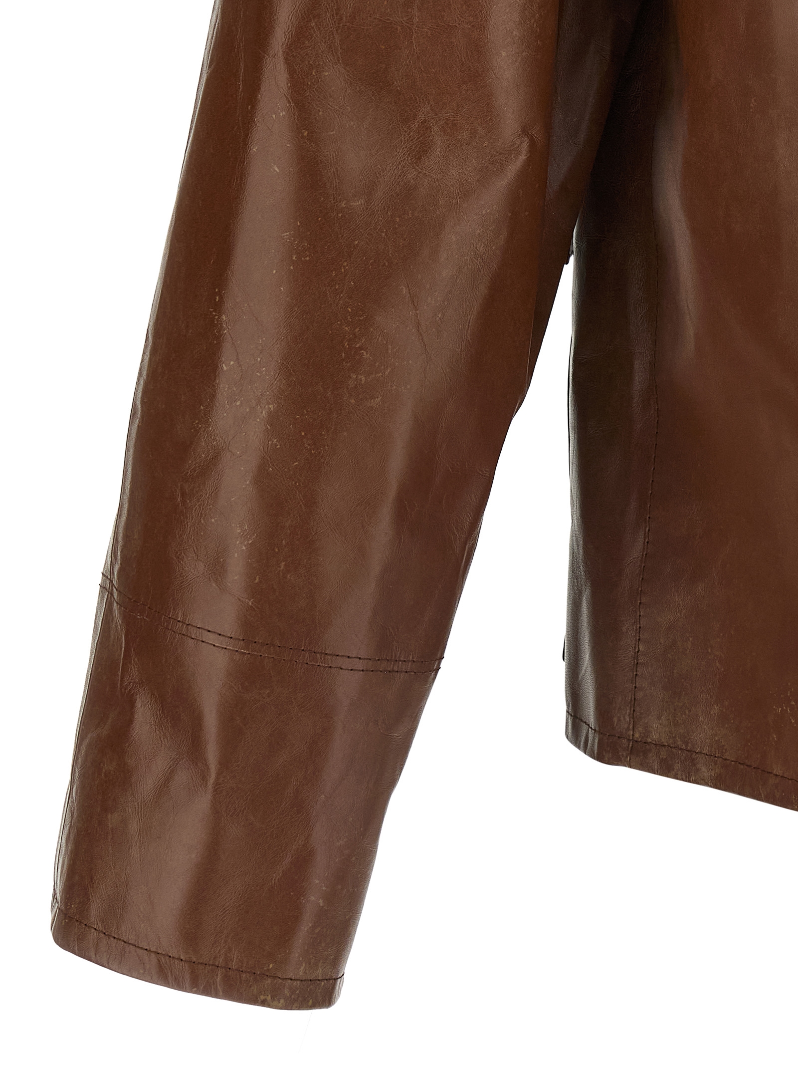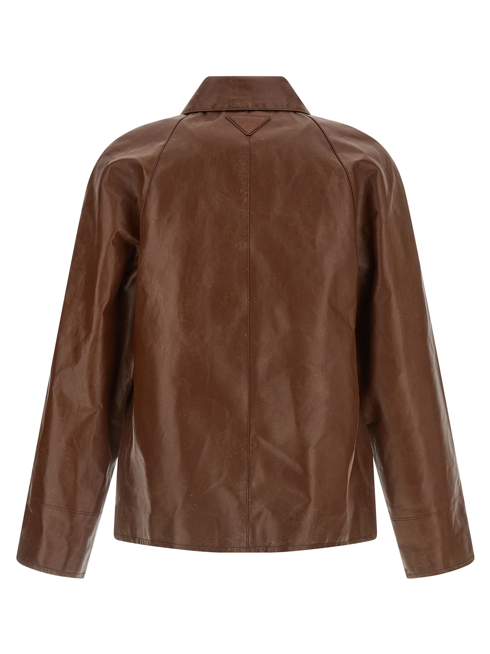Leather blouson with vintage treatment, shirt collar with chinstrap, front hidden button closure, patch pockets, long raglan sleeves, tone-on-tone triangle logo on the back, lining.