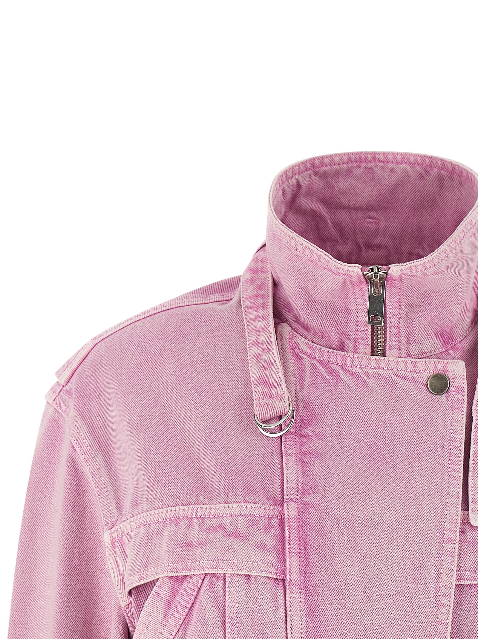 'Joseline' dellavé cotton denim canvas jacket, adjustable high neck with metal buckle, concealed front zip closure, long sleeve pockets with cuffs and dropped shoulder, adjustable side straps on the hem, unlined back leather logo tag.