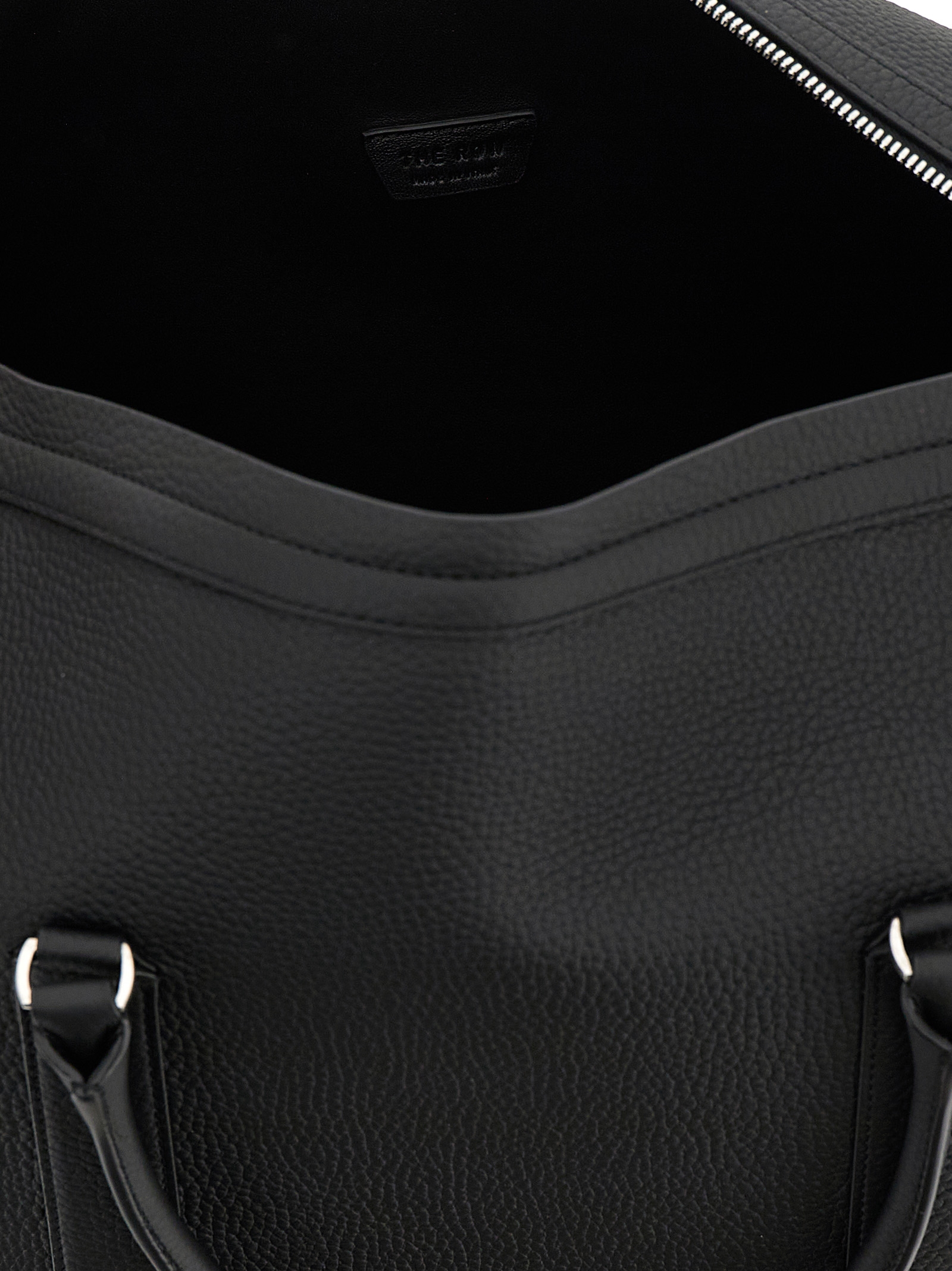 'Iowa' fine-grained calf leather travel bag, leather lining, antique silver metal trim, double fixed leather handle, removable and adjustable leather shoulder strap, double zip closure.