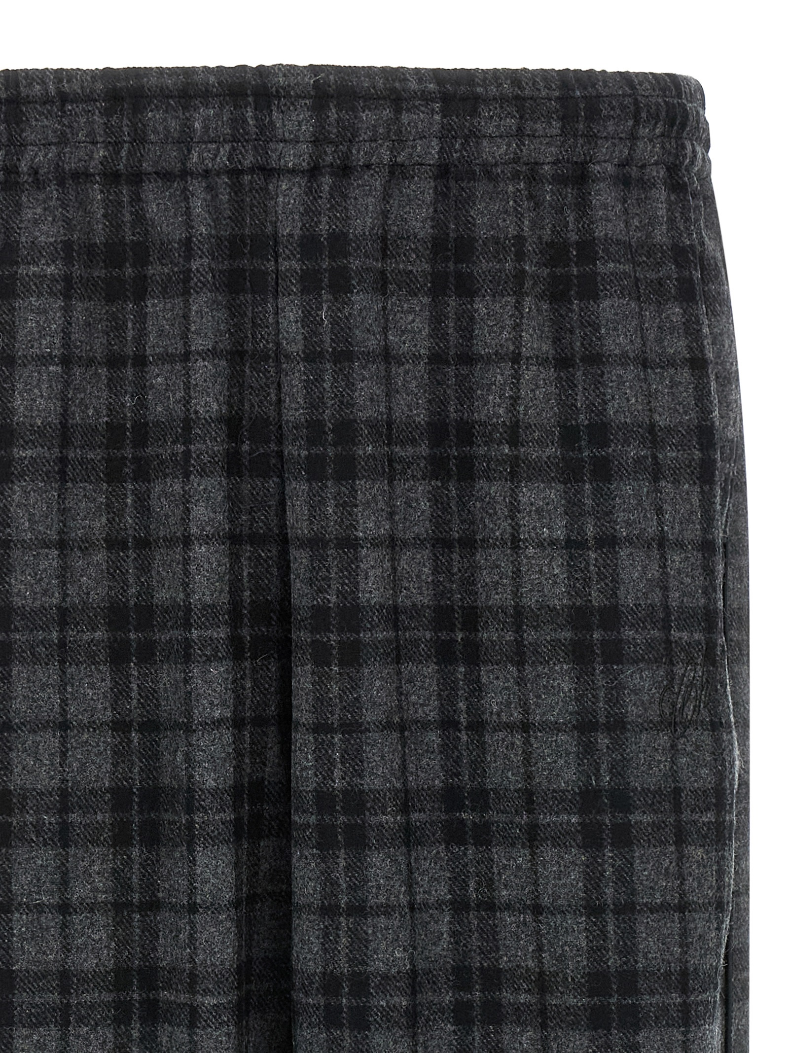 'Ruff Rider' pants in wool with all-over check print, satin side bands, tone-on-tone logo embroidery on the front, low crotch, adjustable drawstring elastic at the waist, pockets.