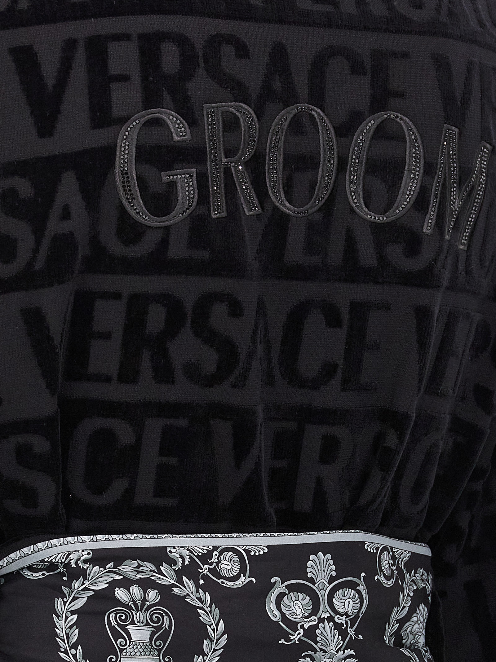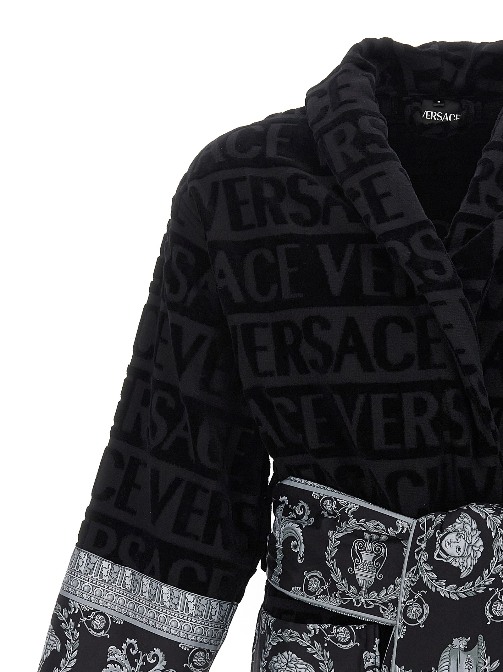 Cotton terry bathrobe with all-over embossed logo, 'Barocco' application detail, knotted belt closure at the waist, hood, pockets, long sleeves.