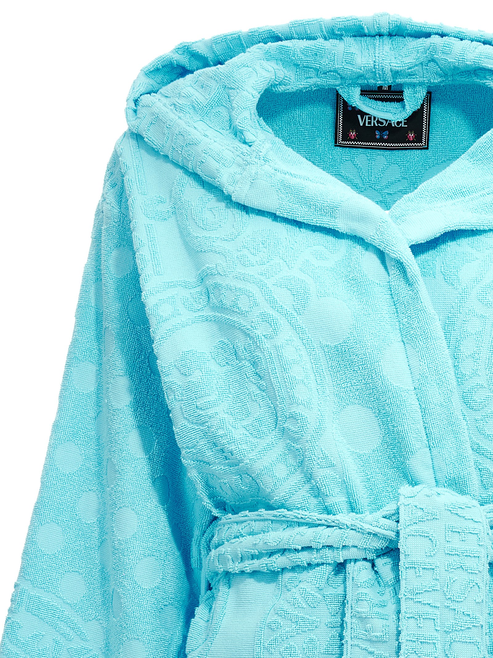 La Vacanza cotton terry cloth short capsule bathrobe with tone-on-tone 'Seashell Baroque Polka Dot' pattern, hood and a belt that can be knotfied at the waist.