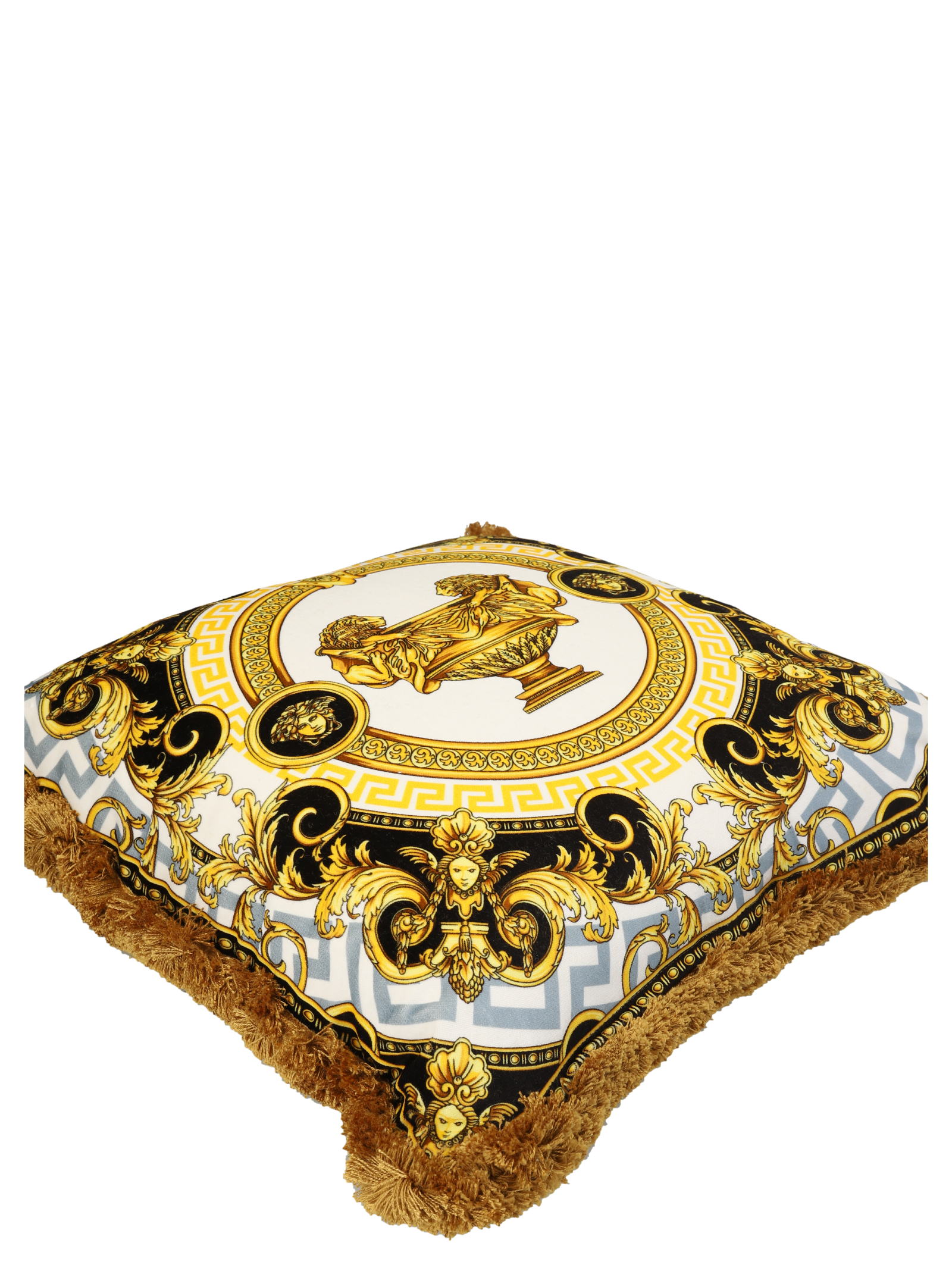 Cushion with fringes and 'La Coupe des Dieux' embellishment.