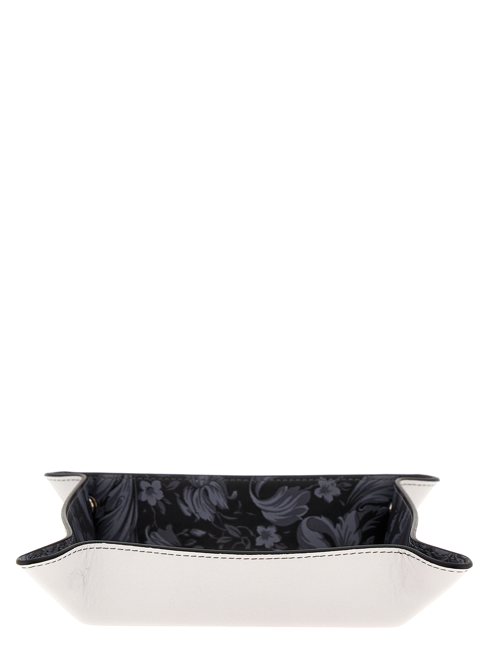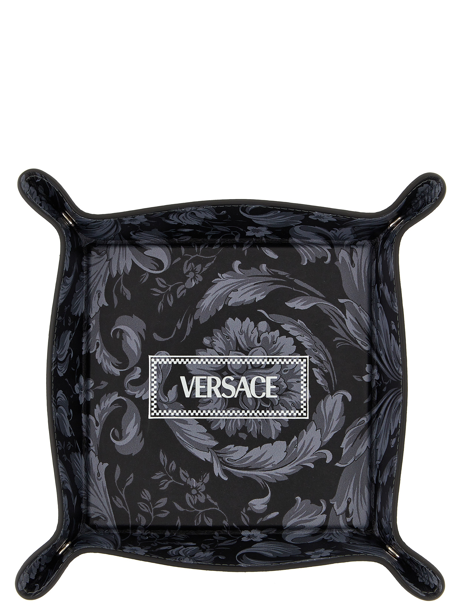 Leather valet tray with all-over 'Barocco' print, logo print, and button-up corners.